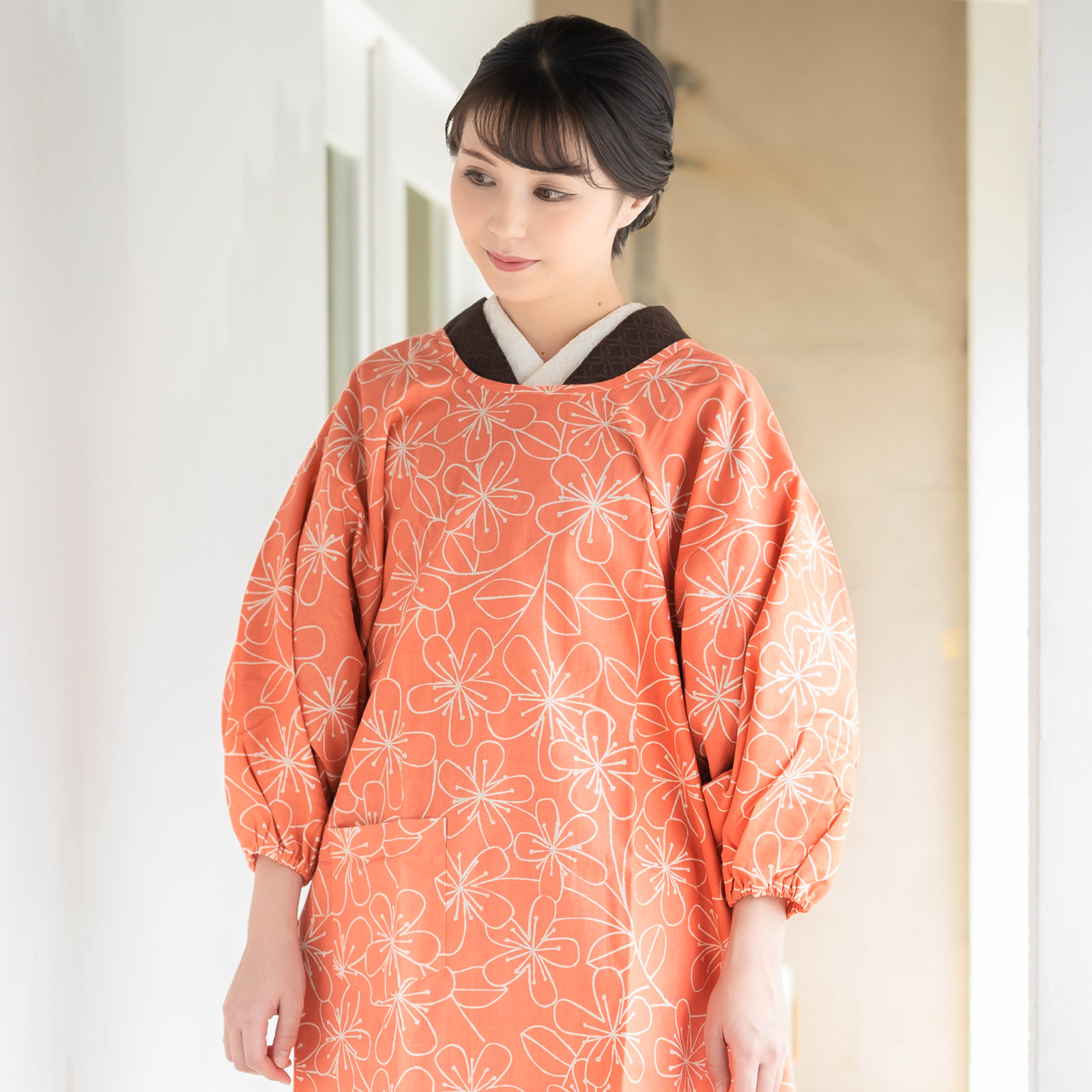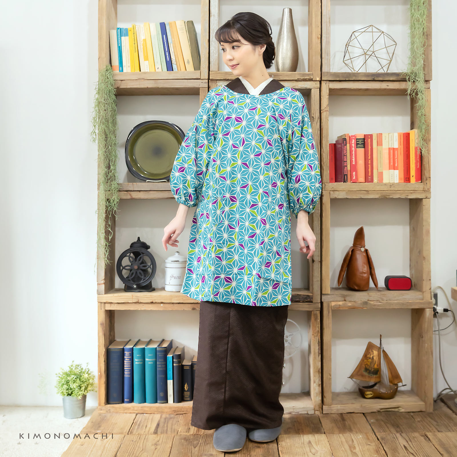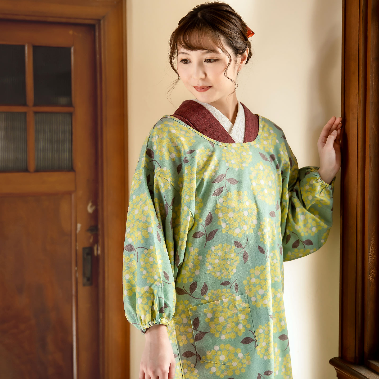 たっぷりとした袖ですが、袖口はゴムで、袖口から着物が出ず、邪魔にならないように工夫されています。 後は首元と腰部分の2箇所に結び紐がついていますので、帯のふくらみにあわせて自由に調節していただけます。 かわいい色柄で家事が楽しくなる、着物にはもちろん、普段使いにも使いやすいオシャレな割烹着です。介護士・幼稚園の先生のお仕事着にも最適です。