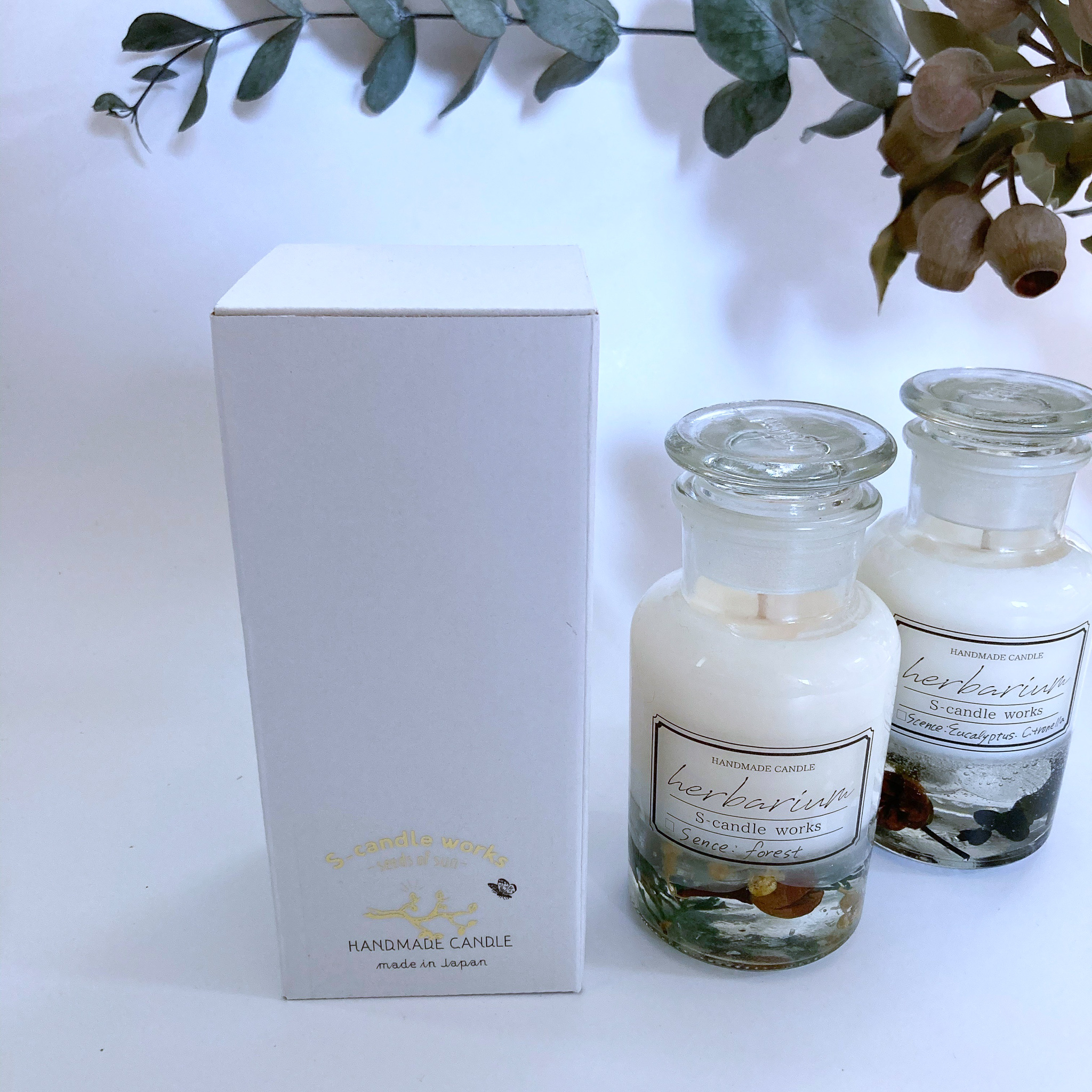 主な花材:ユーカリと木の実 燃焼時に安全なキャンドル用のアロマオイルを使用しています。 ※長時間ご利用の際は、瓶が熱くなりますのでご注意ください。