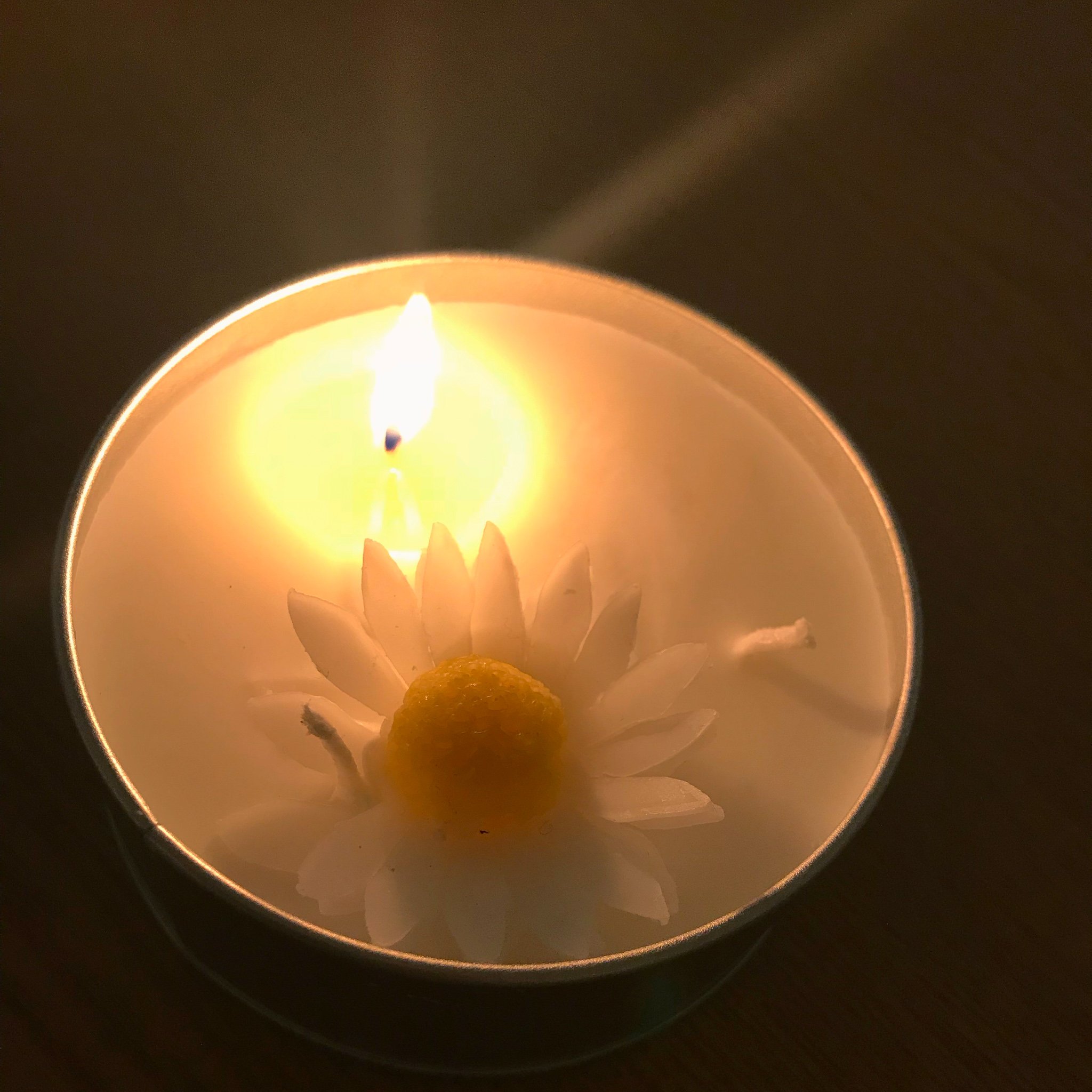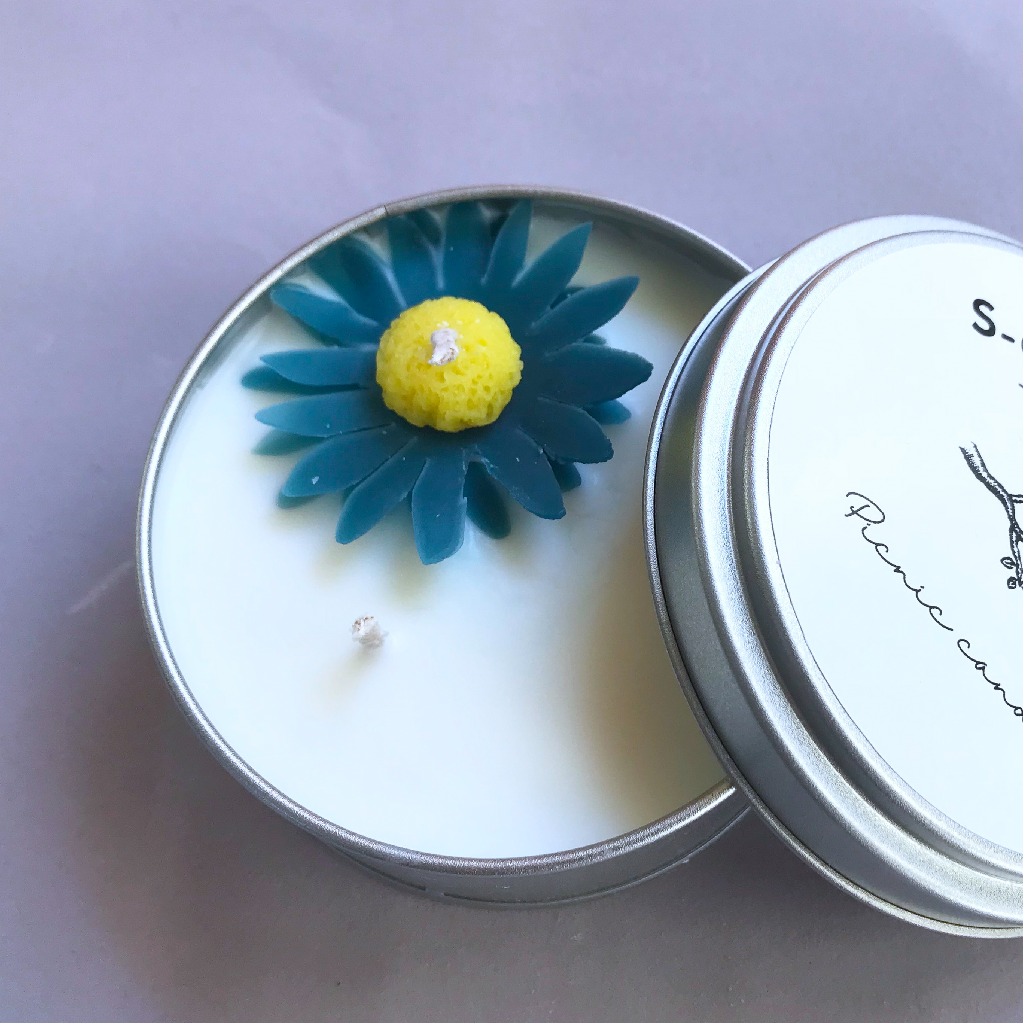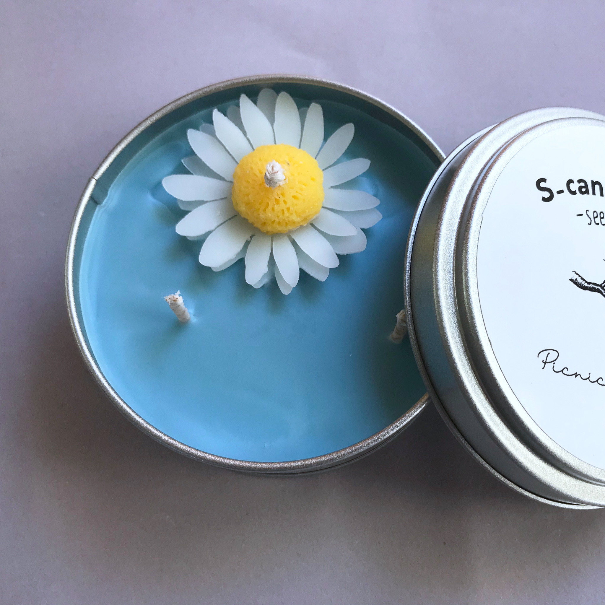 煤が出にくいソイワックスを持ち運べる缶にたっぷり入れたピクニックキャンドルです。蓋を開けると、シンプルでかわいらしい蜜蝋のマーガレットが入っています。燃焼時に安全なキャンドル用のアロマオイルを使用しているのでアウトドアやバスタイムでもお花の香りを楽しめます。