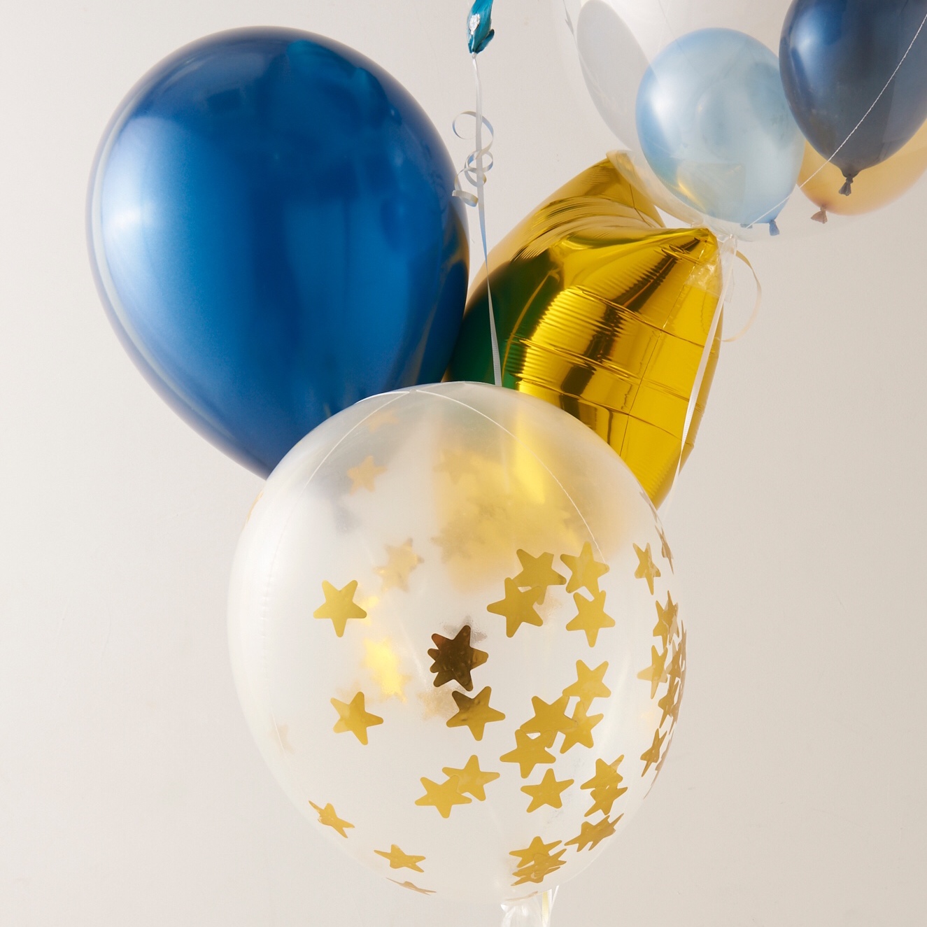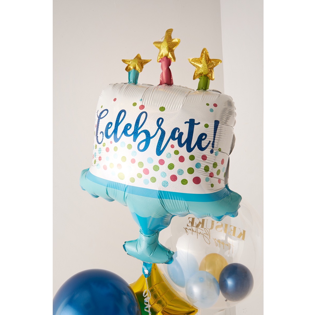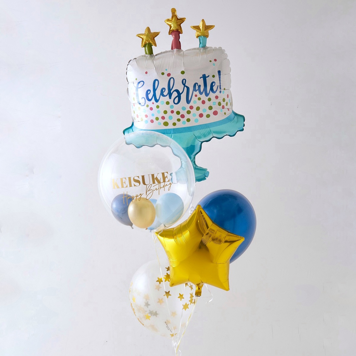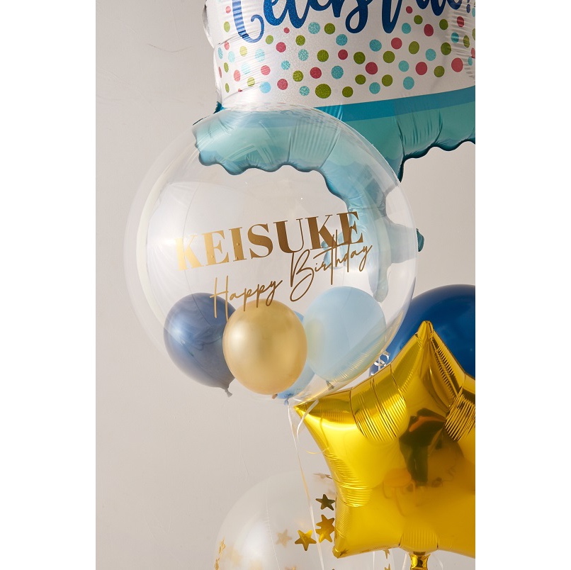| 原材料 | ■Celebrateケーキバルーン 1個 ■バブルバルーンSサイズ 1個 中のバルーン:ネイビー、ブルー、ゴールド、マットパステルブルー ■ミニスター:ゴールド 1個 ■ゴム風船フィルム加工 ・ネイビー 各1個 ・星型ゴールドコンフェッティ入り 1個 |