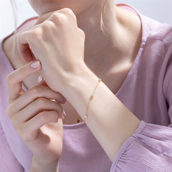きらめくキュービックジルコニアを1粒あしらった、2連のブレスレット。 ピンクゴールドカラーの色合いが手元で優しく輝きます。異なるチェーンの組み合わせが、動くたびに光を受けてきらりときらめき、シンプルながらも華やかな印象に。