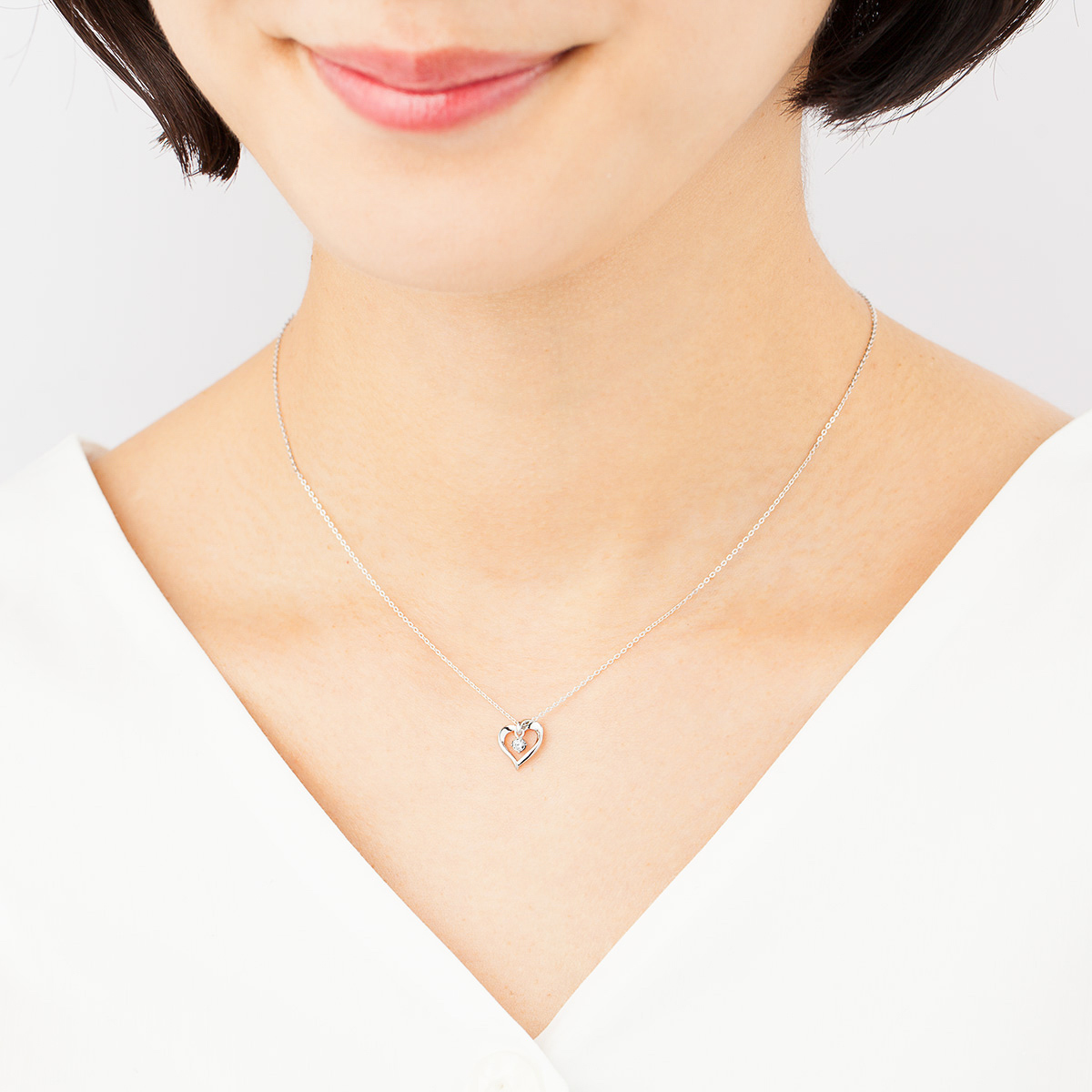 シルエットの美しい洗練されたデザイン。上品に輝かしい女性らしさを演出してくれるネックレスです。愛らしいハートモチーフ付きで女性の可愛らしさをイメージさせます。キュービックジルコニアが優美に揺れ動く姿はとても魅力的な印象を与えてくれます。