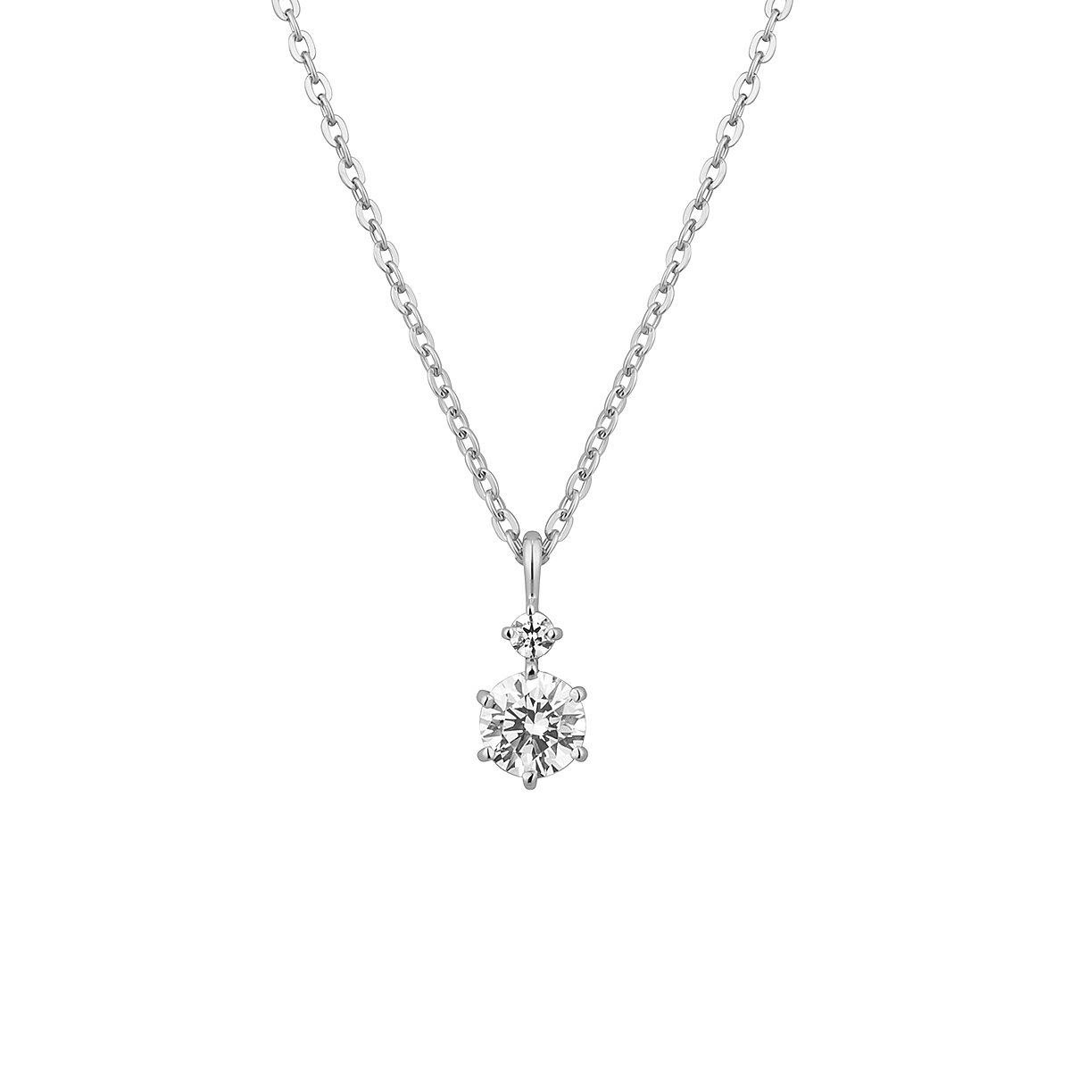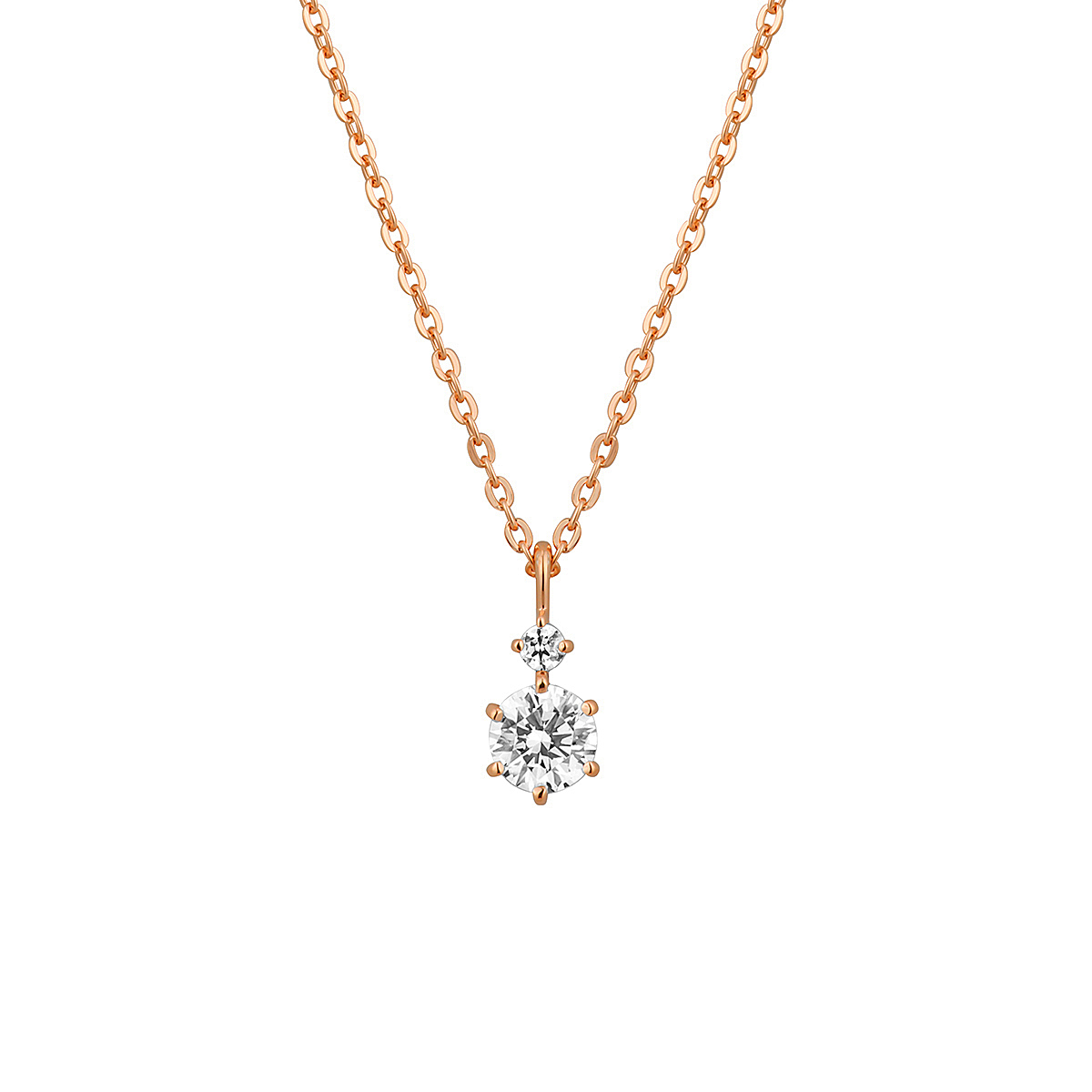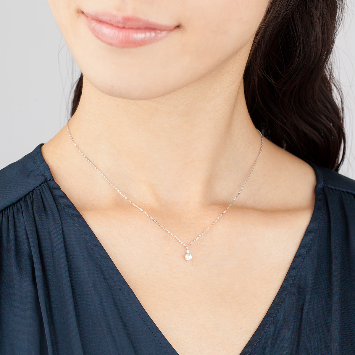 シンプルなデザインで胸元で上品に2粒のキュービックジルコニアが煌めき華を添えるネックレス。ベーシックで人気なデザイン。洗練されたネックレス、毎日のコーディネートにも合わせやすく、楽しむことができます。