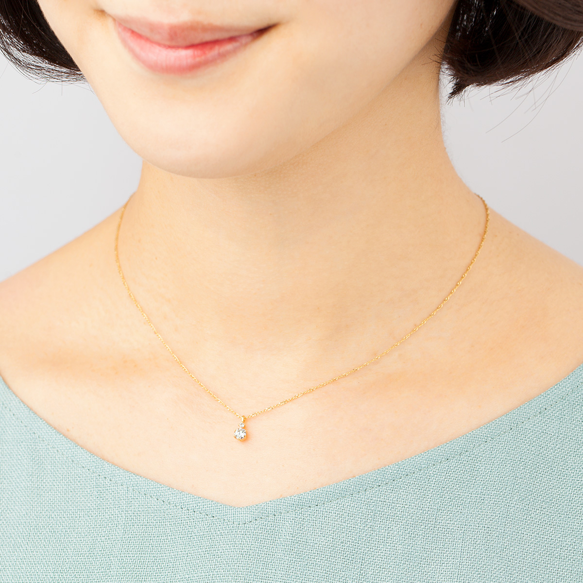 洗練された2石のキュービックジルコニアが華やかにきらめく、シンプルなネックレス。より小さな爪で留めることで、石の存在感を際立たせています。しなやかな輝きが魅力的なチェーンなので女性の美しさを演出します。