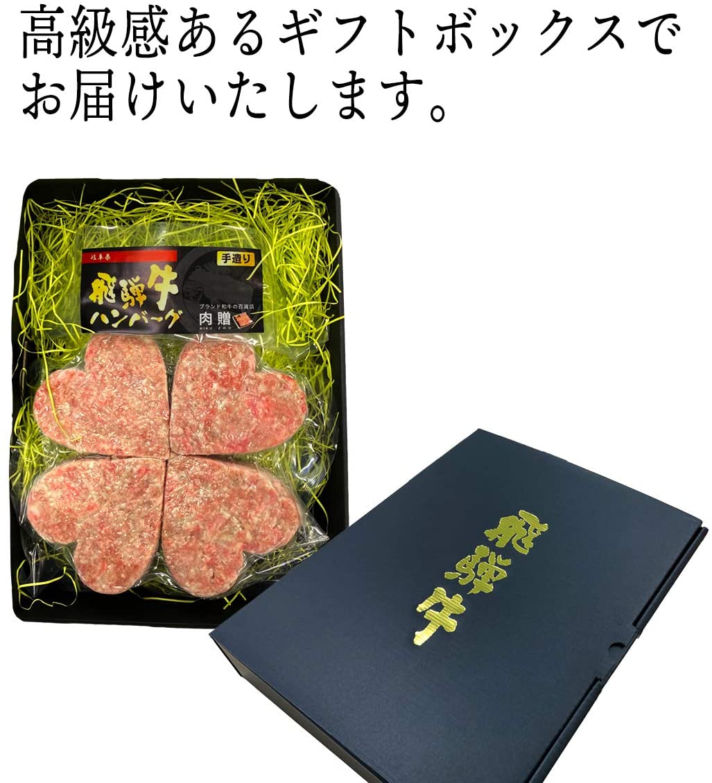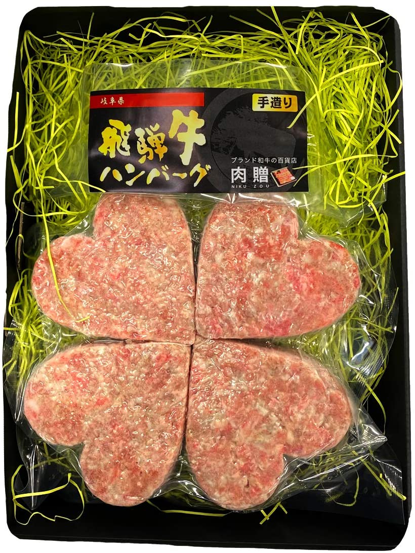 | 内容量 | 飛騨牛 ハートハンバーグ A5 A4 100g×4個(100%ハンバーグ 2個・50%合挽ハンバーグ 2個)※2〜4人前 |