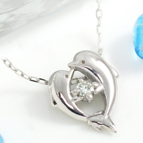大口注文・法人のお問い合わせはこちら寄り添ったイルカの可愛らしいデザインのネックレス。 胸元に浮かび上がるシルエットは、ロマンティックなハートの形です。