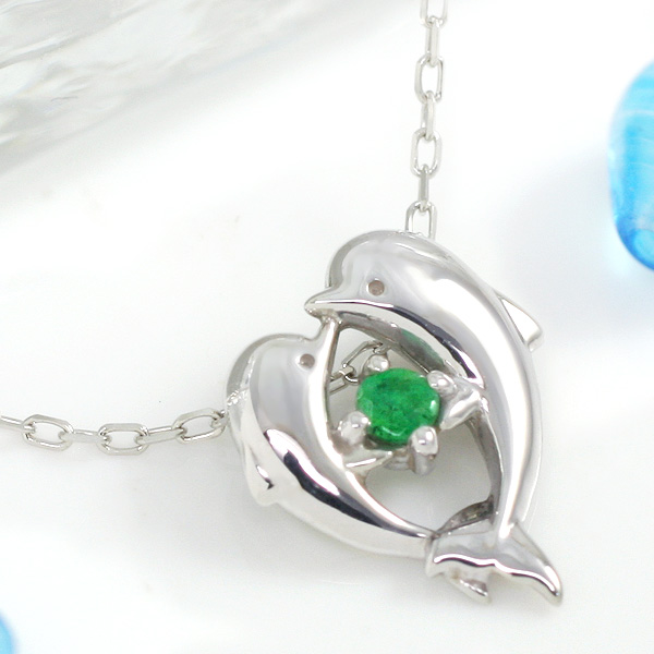 艶やかなドルフィンハートの真ん中には5月の誕生石エメラルドが、 眩しいほどのときめく恋心のような輝きをキラキラと放ちます。