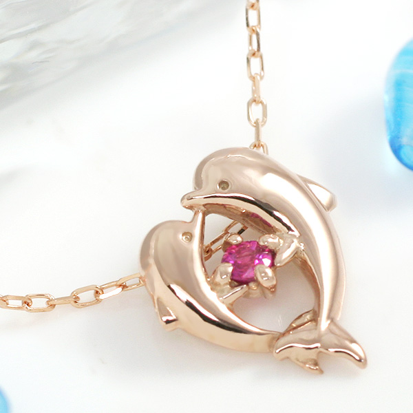 天然石ルビーのエレガントな真紅の輝きで、美人度とリッチ感もグンとUP! 愛と平和の使者イルカが抱く「恋のお守り石」ルビーはこれからの二人の愛を育んでいく愛の結晶のようです。