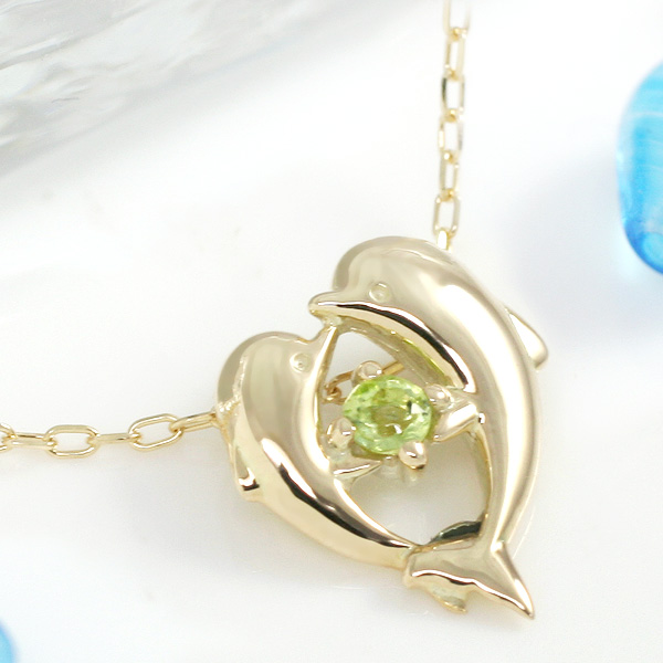 艶やかなドルフィンハートの真ん中には8月の誕生石ペリドットが、 ワクワクとときめく恋心のような輝きを眩しく放ちます。