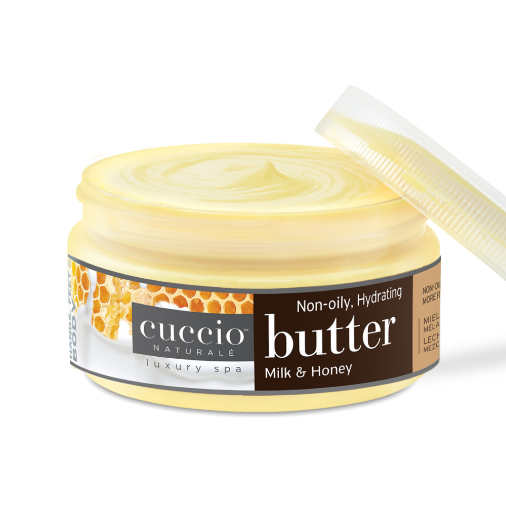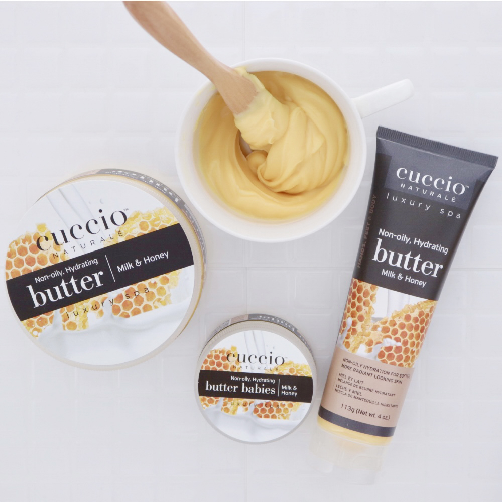 カリフォルニア生まれのオーガニックブランド「cuccio naturale(クシオ ナチュラーレ)」のバターブレンド。ベタつかずスムーズに肌に浸透し、キメを整え24時間潤いをキープします。ハチミツ、ミルク成分で、肌に潤いを与え、柔らかなハリのあるお肌へ。