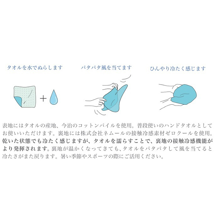 大口注文・法人のお問い合わせはこちら一見すると普通のスポーツタオルですが、水で湿らせることでヒンヤリ冷たい肌触りに変身する「冷たく感じるタオル」です。厚みのあるしっかりとした素材の表地は、良質タオルでお馴染みの今治タオルです。裏地にはネムール株式会社の接触冷感素材ゼロクールを使用しています。