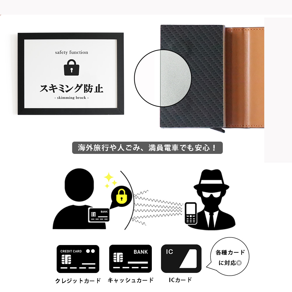 スキミングとはクレジットカードなどのデータを盗み取ることです。近年では近づいただけでカード内のデータが盗まれる「非接触式」被害のリスクが高まっています。スキミング防止機能が付いているので、安心してお使いいただけます。
