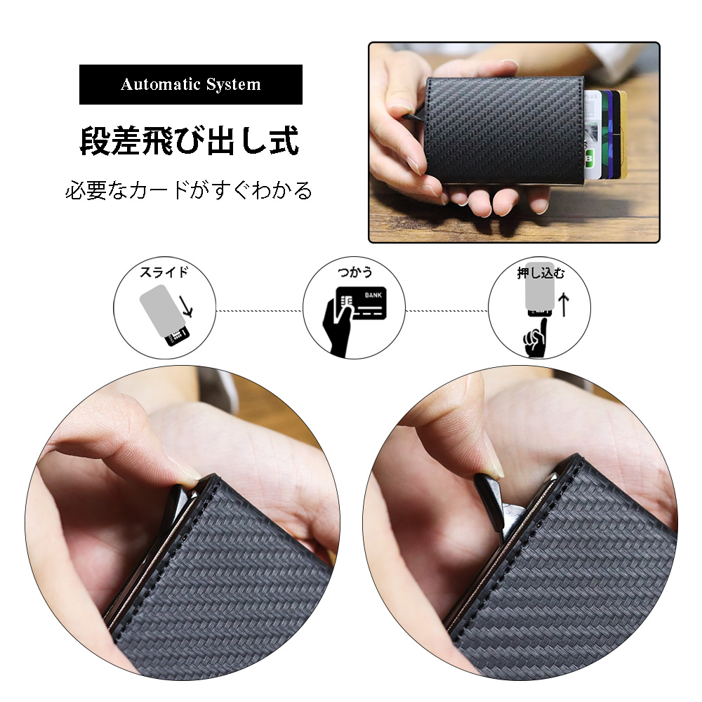 カードを取り出すときに上手く取り出せず手間取ったことはありませんか。お財布の端にあるつまみをスライドすると、ワンタッチでシュッとカードが飛び出します。段差を付けて出てくるので、カードが重なって見にくくなることはありません!
