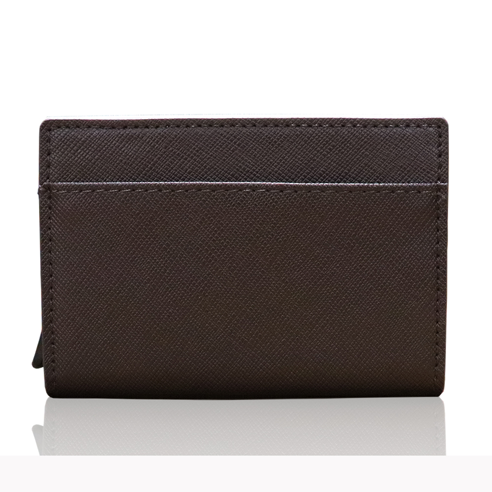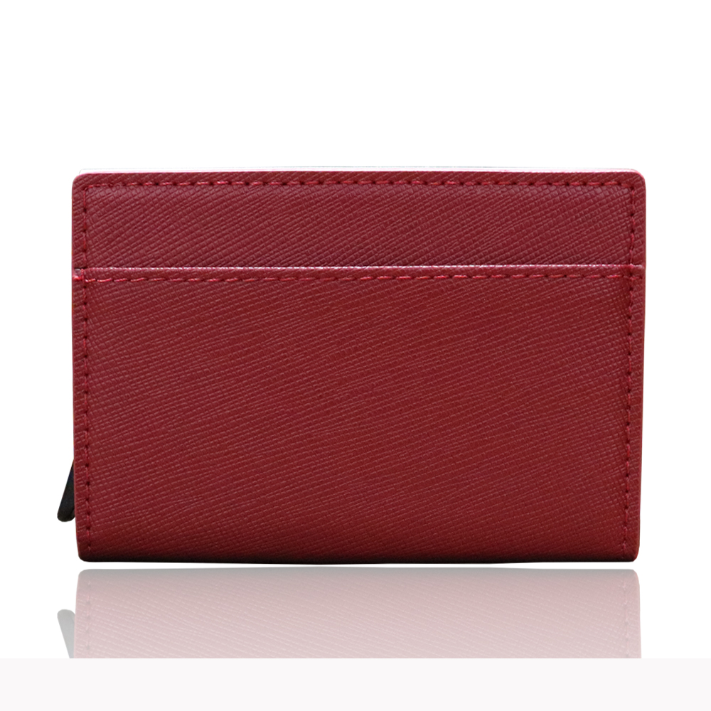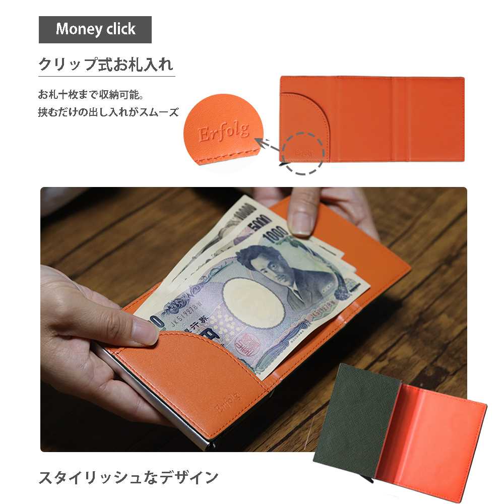 「Erfolg(エアフォルク)」がお届けする、牛の本革を使用したミニ財布です。カードの取り出しはワンプッシュのスライド式で、サッと取り出せます。カード入れはスキミング防止のためにアルミ素材を使用しています。収納力もありながら、三つ折りにすると手のひらサイズに!