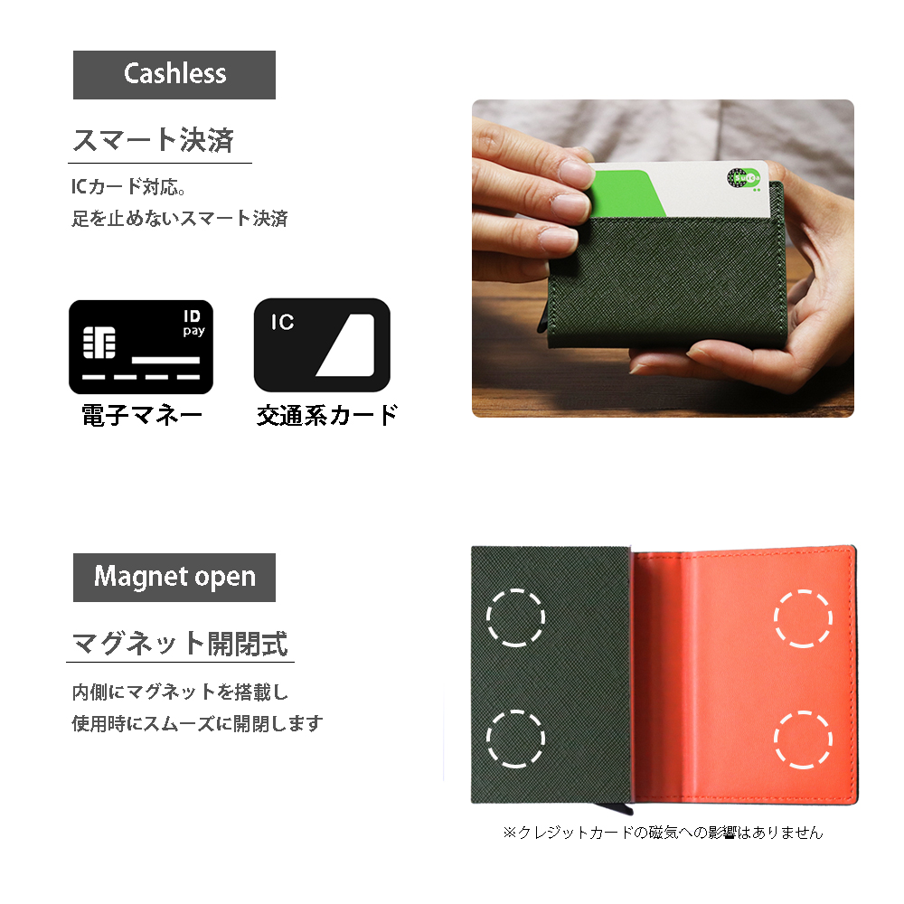 | 使用上の注意点・使用方法 | 磁気を使用しておりますので、キャッシュカードとクレジットカードを重ねて収納することはお控えください。 |