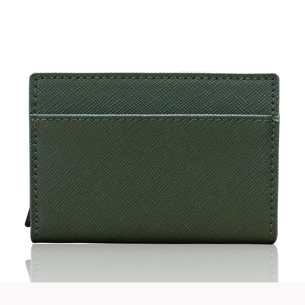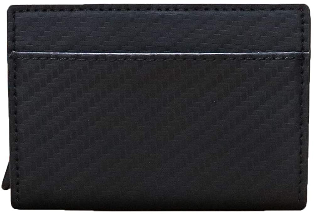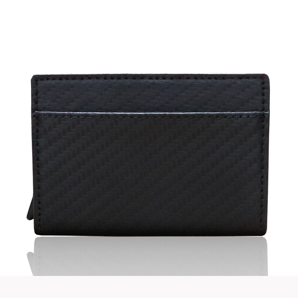カードを入れるためのケース部分は、スキミング防止のためにアルミを使用しています。また、わずか99gという軽量化を実現しました。カードは最大5枚収納可能です。1枚だけ入れても落ちないような設計ですので安心してお持ちいただけます。