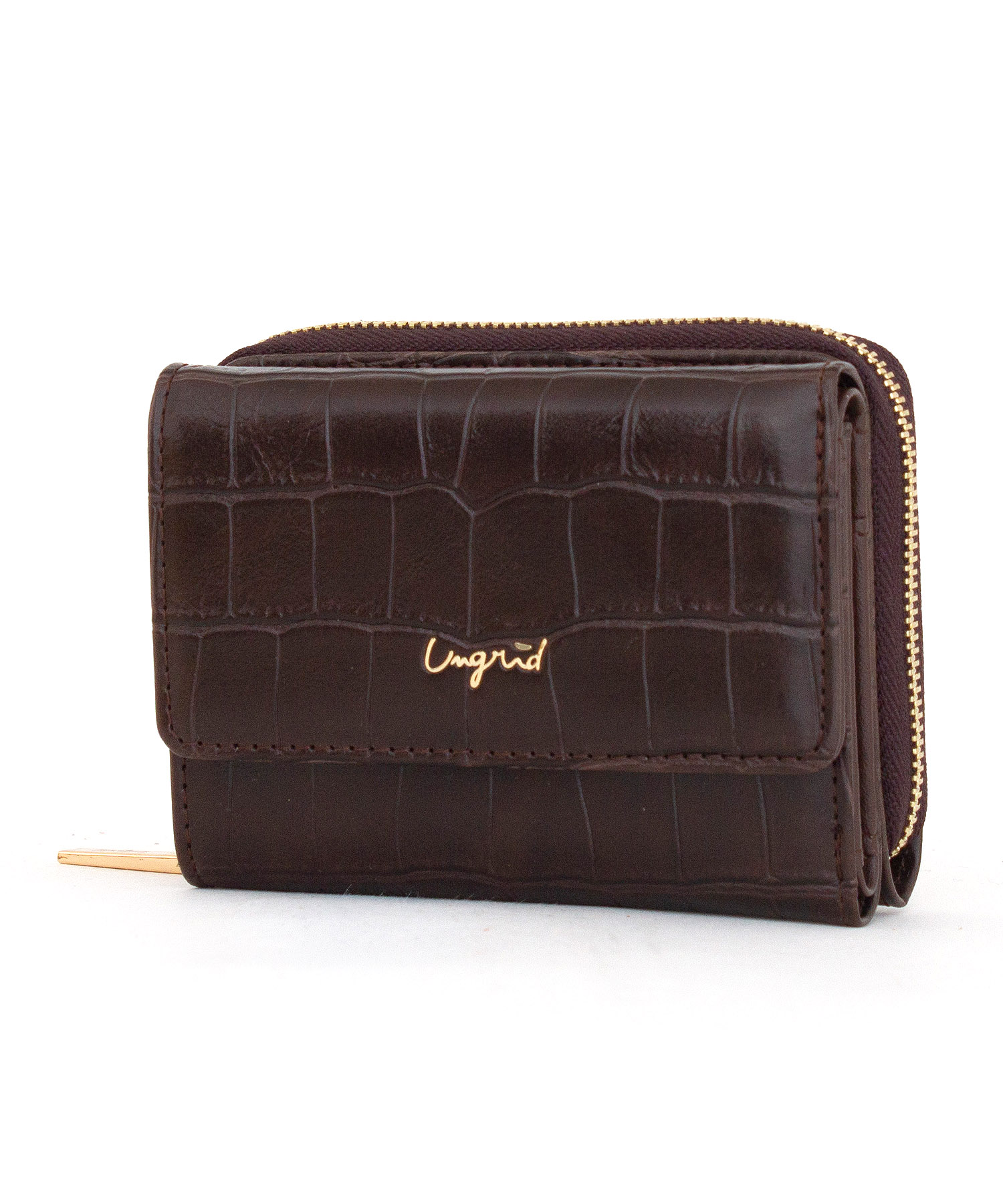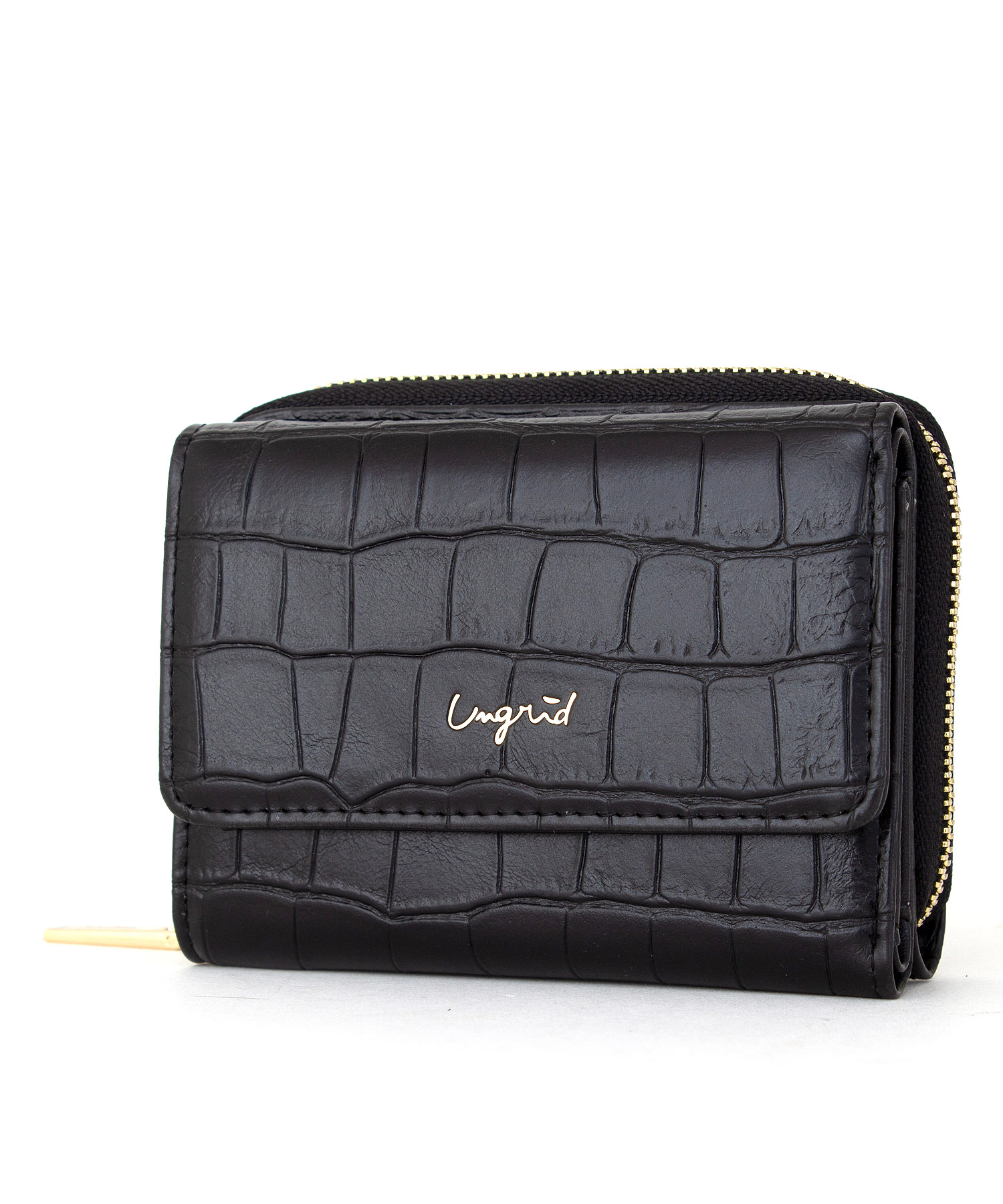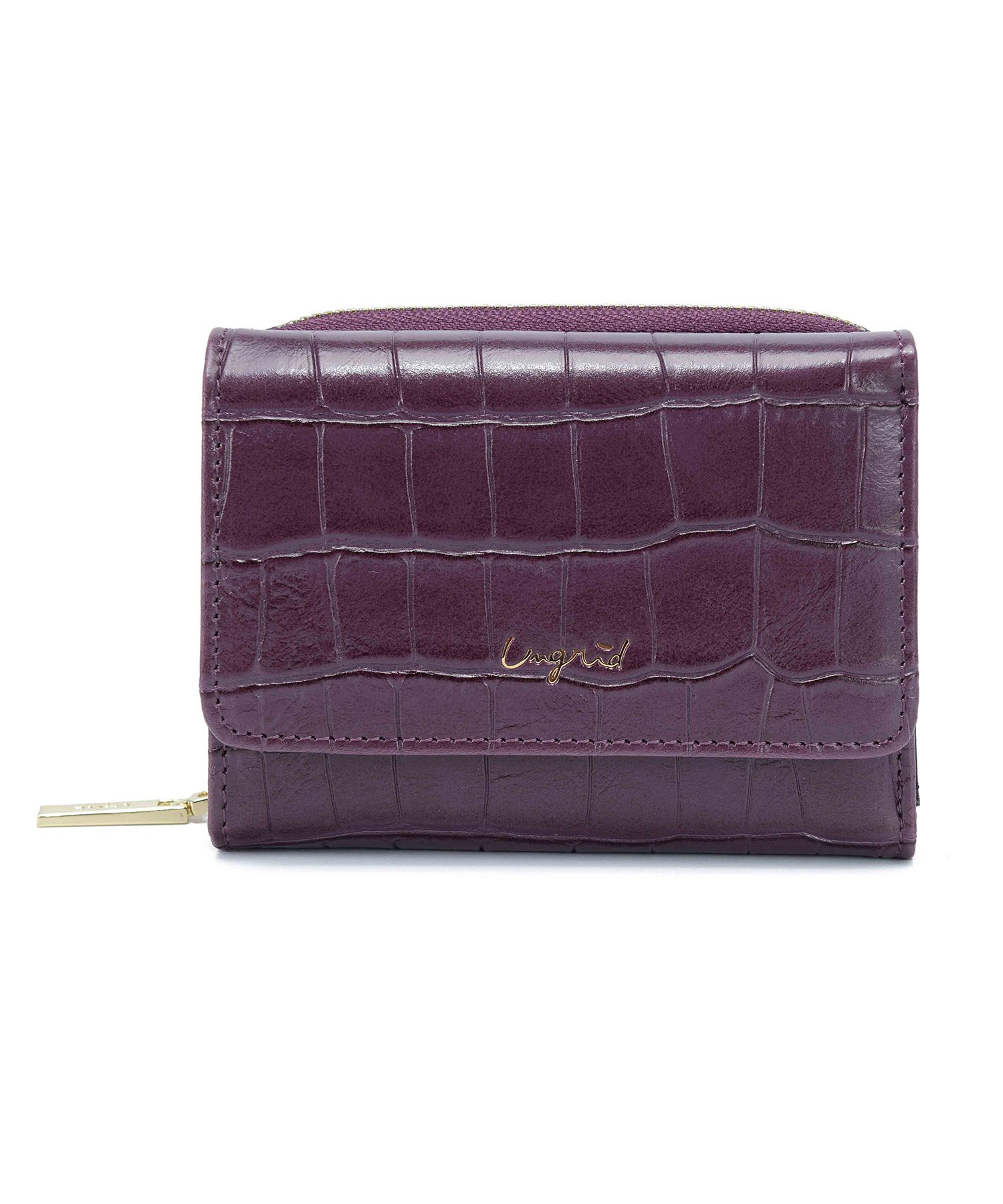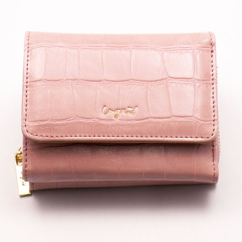 大口注文・法人のお問い合わせはこちら独立したコインポケットやたっぷり収納出来るカードポケットなどミニサイズながら機能は充実。人気のクロコ風型押し素材に、ゴールドの華奢ロゴや引き手でアクセントを付けたデザインに仕上げました。紙幣を折らずに入れられ、外側にラウンドの小銭入れがついていて沢山入るので収納力も抜群です。