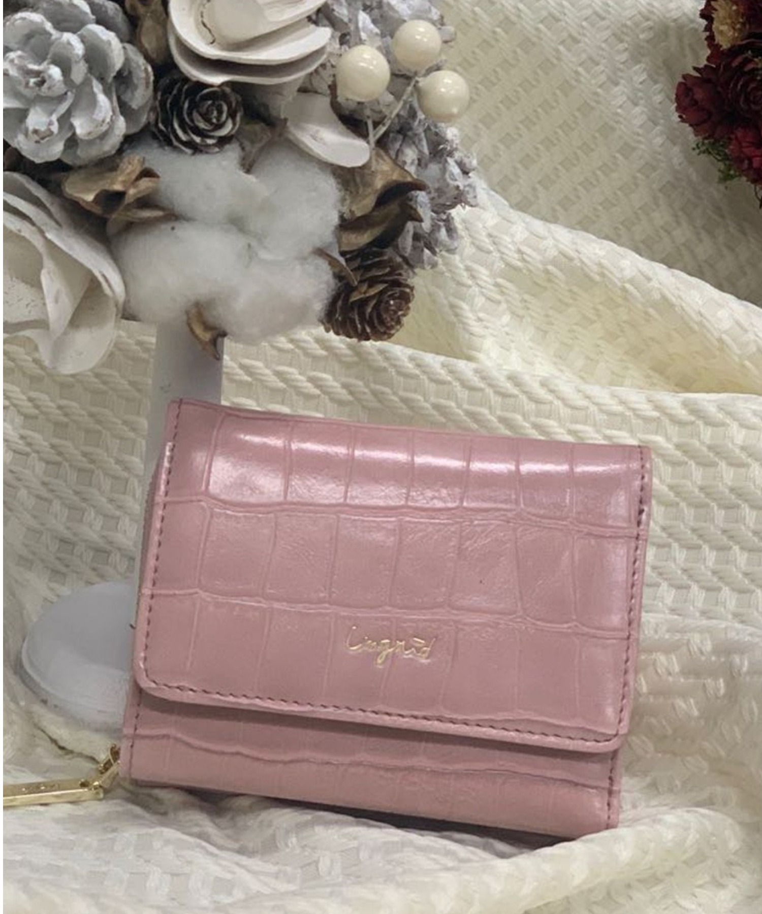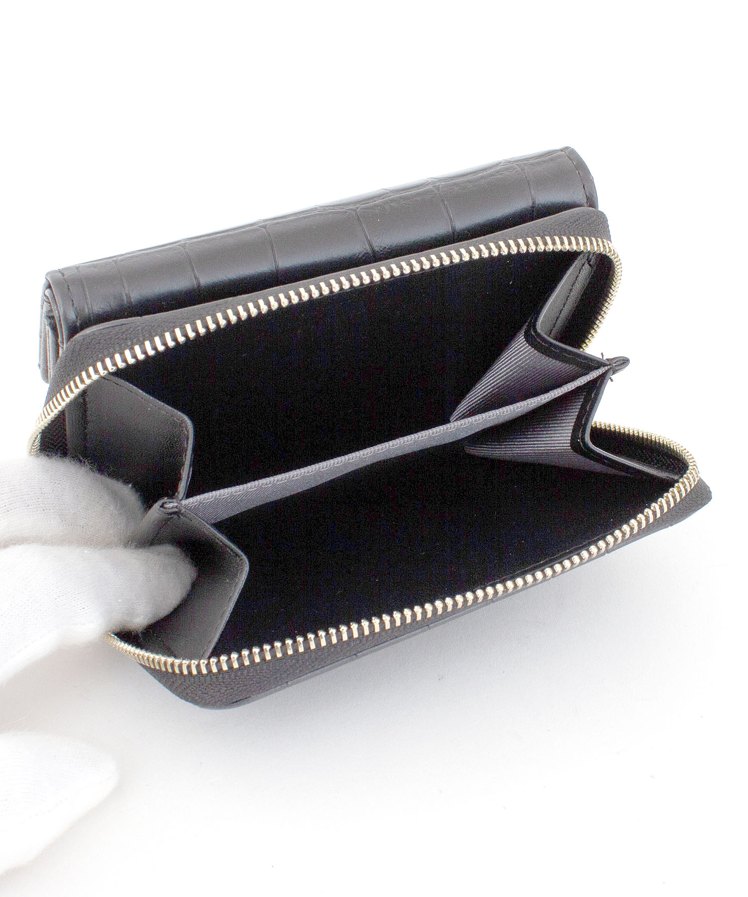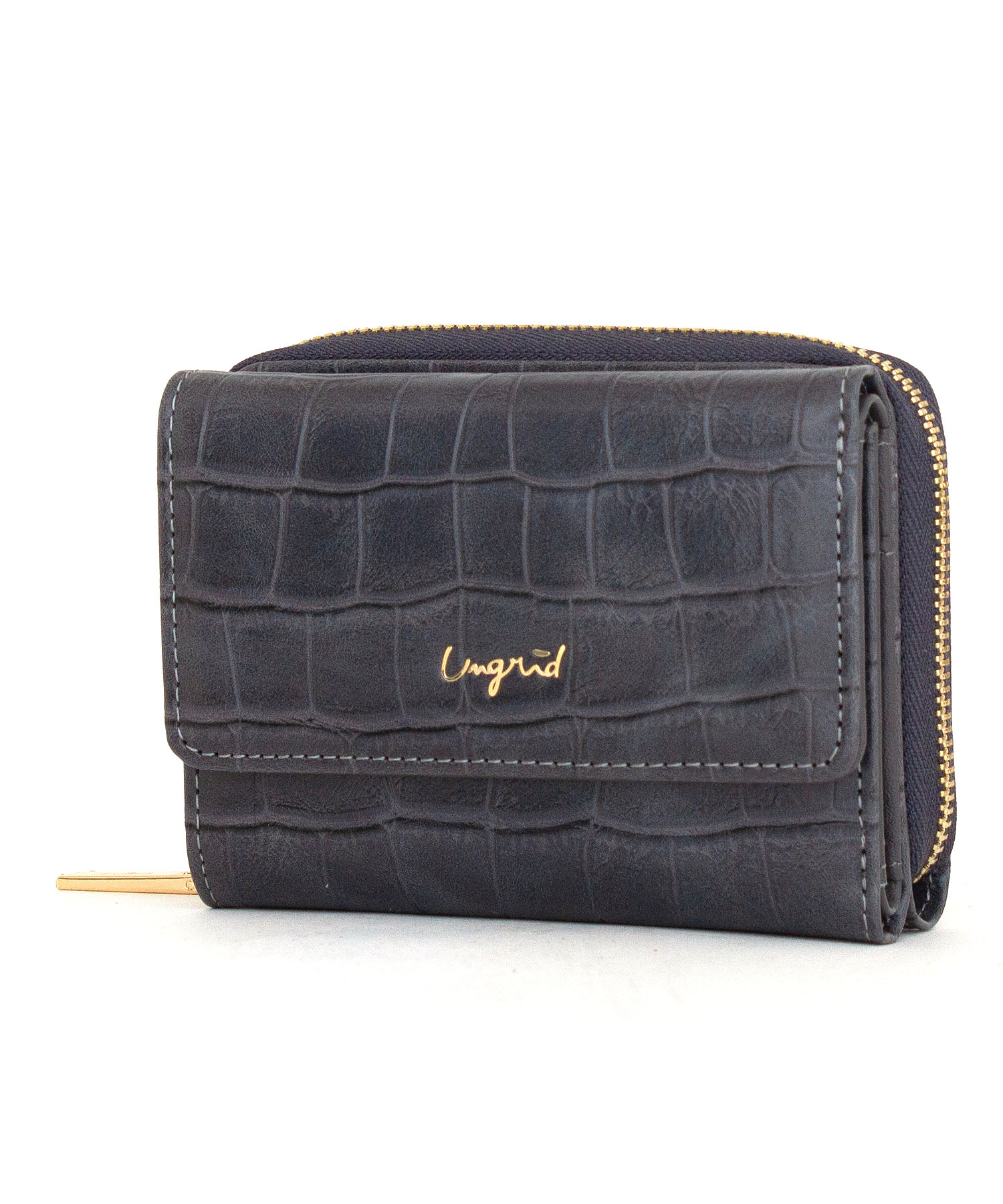 大口注文・法人のお問い合わせはこちら独立したコインポケットやたっぷり収納出来るカードポケットなどミニサイズながら機能は充実。人気のクロコ風型押し素材に、ゴールドの華奢ロゴや引き手でアクセントを付けたデザインに仕上げました。紙幣を折らずに入れられ、外側にラウンドの小銭入れがついていて沢山入るので収納力も抜群です。