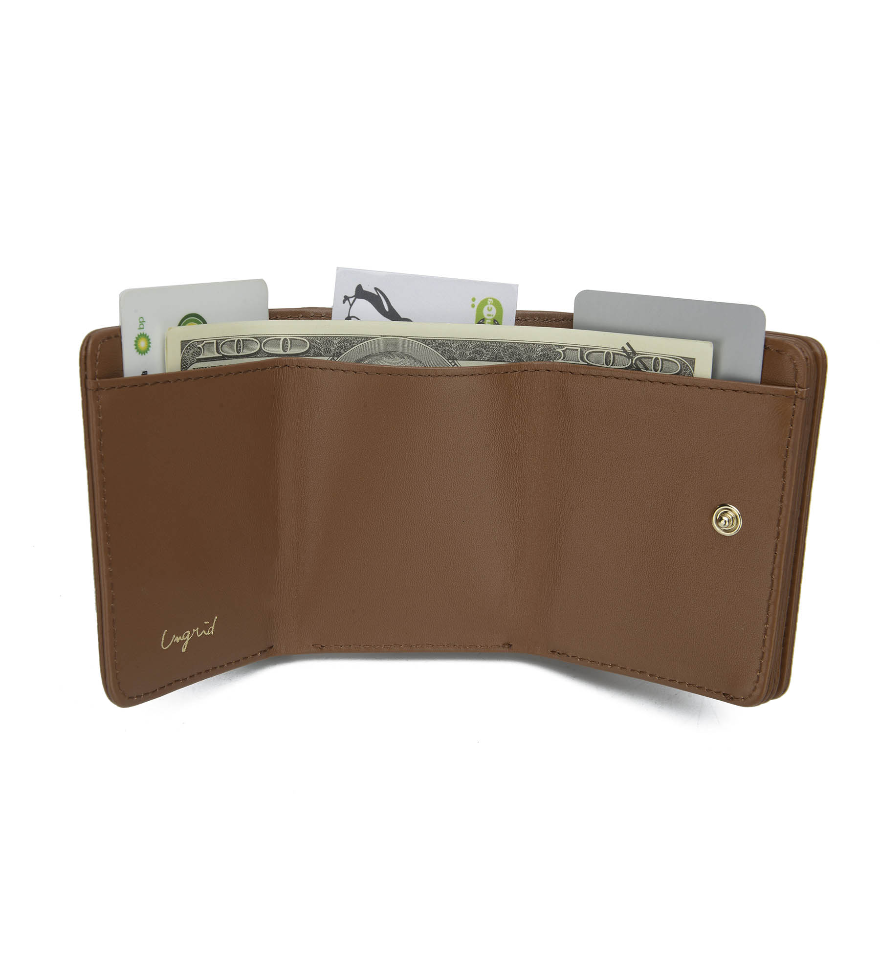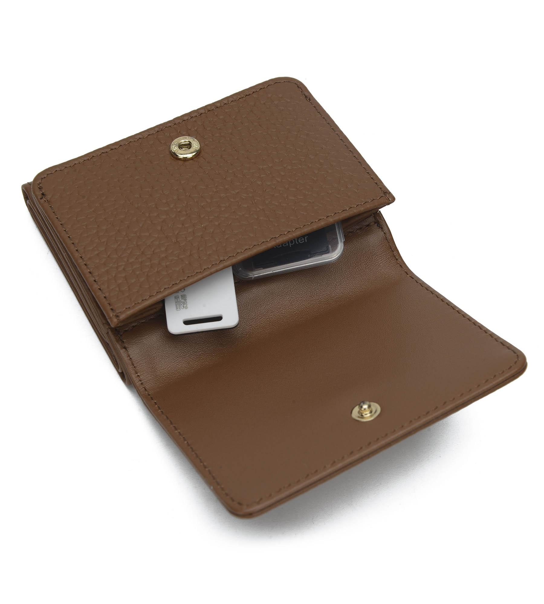 手のひらサイズの牛革を使用している三つ折りミニWALLET。コンパクトサイズなのに、そのサイズからは想像できない収納力です。