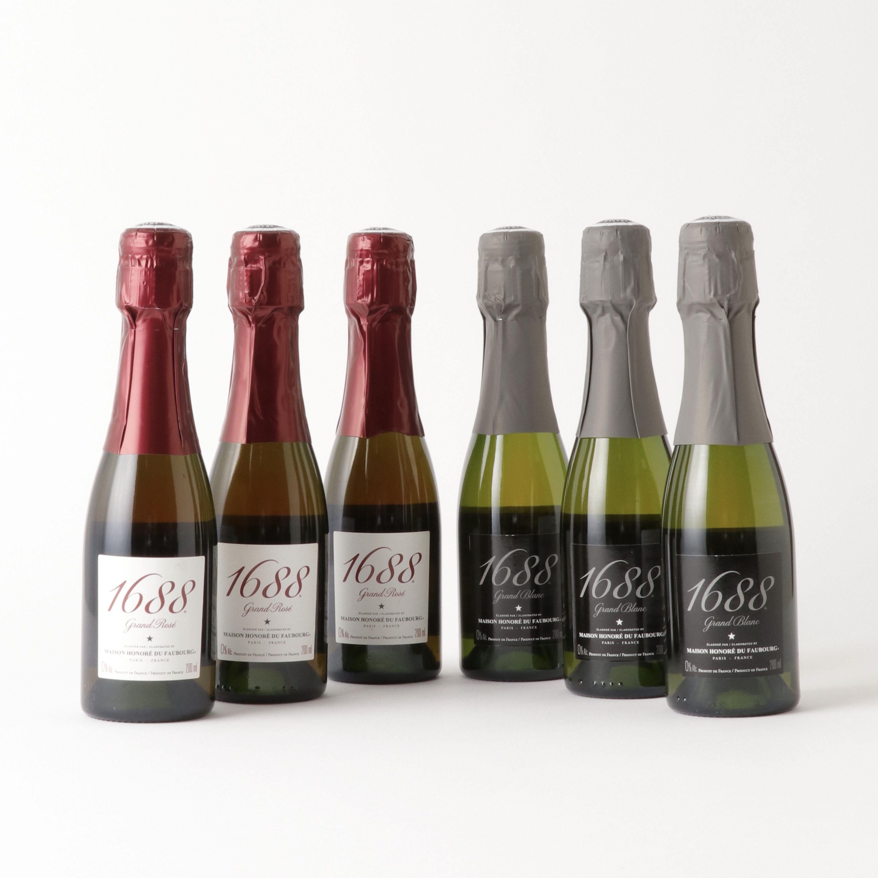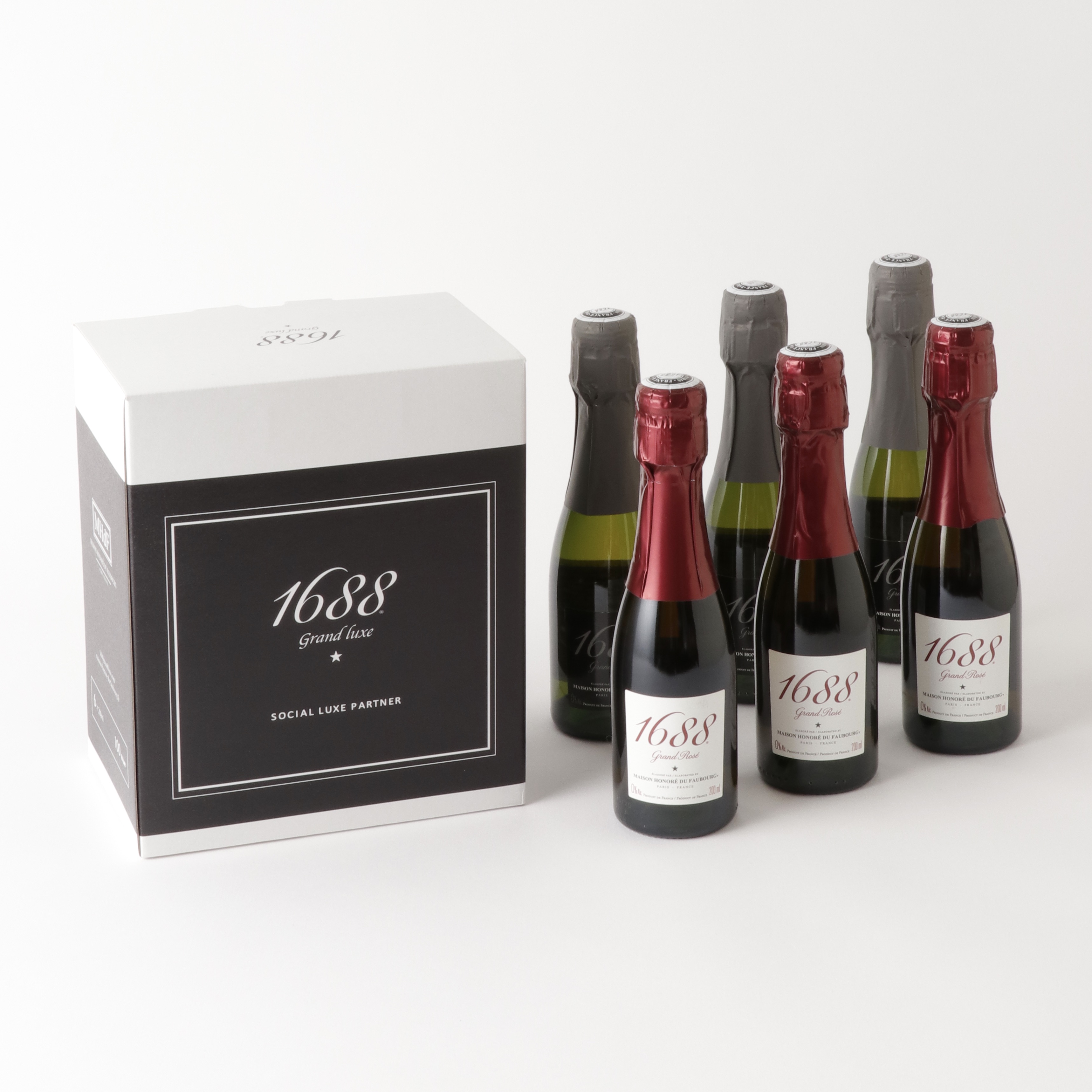 大口注文・法人のお問い合わせはこちらフランス製最高級ノンアルコールスパークリング 1688 Grand Rosé(グラン・ロゼ)&Grand Blanc(グラン・ブラン)の200mlミニボトルが各3本(6本)セットになった、パーティー向け紅白セット。洗練されたスタイリッシュな化粧箱入りでご用意しました。
