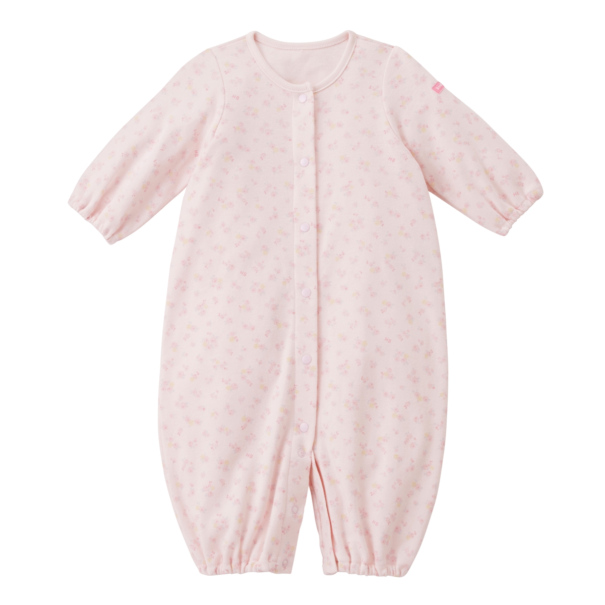 新生児のウェア、ツーウェイオール。股下のホックの付け替えで、赤ちゃんの成長に応じて、2通りのウェアの形に変えてご使用いただけます。