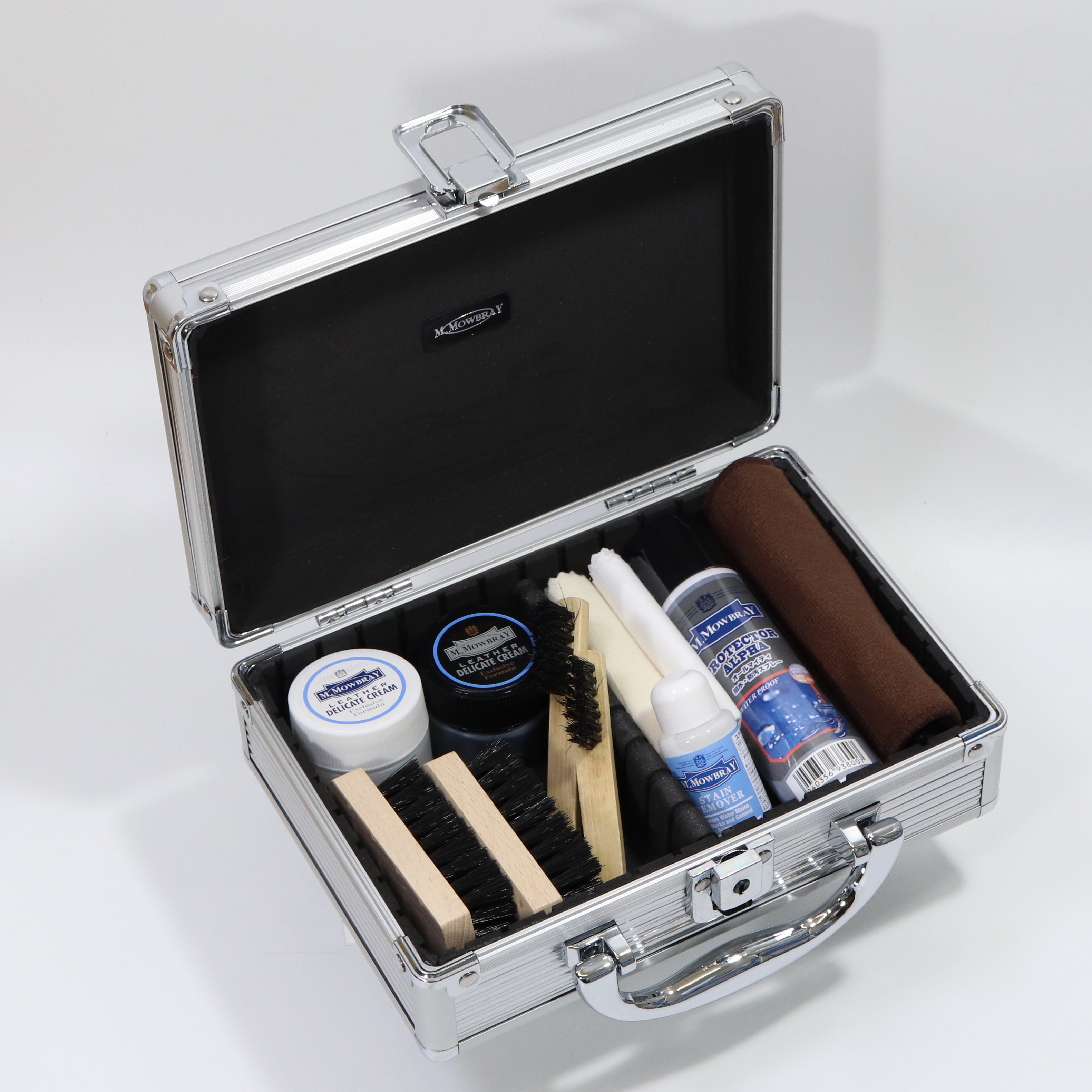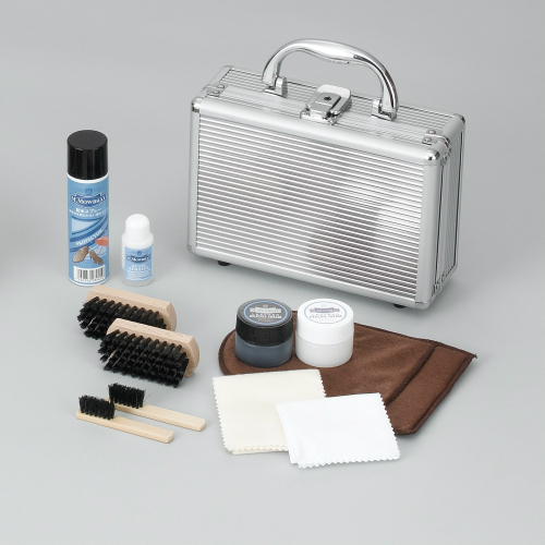 大口注文・法人のお問い合わせはこちらロックがかけられるアタッシュケース式のBOXに入ったシューケアセットです。ロングセラーのM.MOWBRAY デリケートクリームミニと程よく色が馴染むM.MOWBRAY デリケートクリームブラックミニも入っています。ミニ防水スプレーも入っているので、出張時の持ち運びにも便利なセットです。