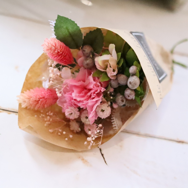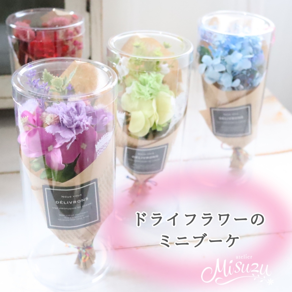 お手入れ不要!大人気のドライフラワーを使用したミニブーケ。ブルー・グリーン・レッド・ライラックピンク・ラベンダー・数量限定のミモザの6色からお選びいただけます。お祝いやお見舞い、サプライズのギフトのちょい足しにもオススメです。ドライフラワーなので花粉の心配もありません。