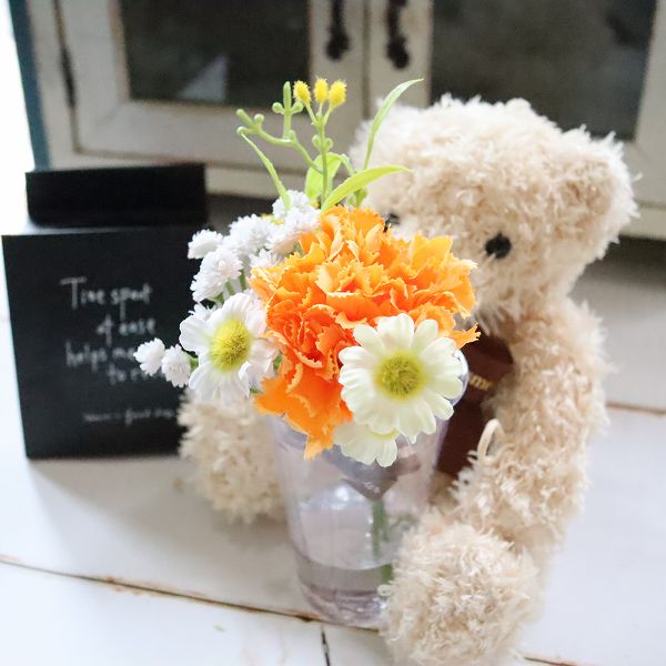 ふわふわなぬいぐるみがお届け!赤とオレンジから選べるカーネーションを使用した、お手入れが簡単なマジカルウォーターのフラワーアレンジです。本物のようにクリアで綺麗なお水にみえるシリコン素材の人工水なので、お水替えの必要もなく、このまま飾っていただけます。