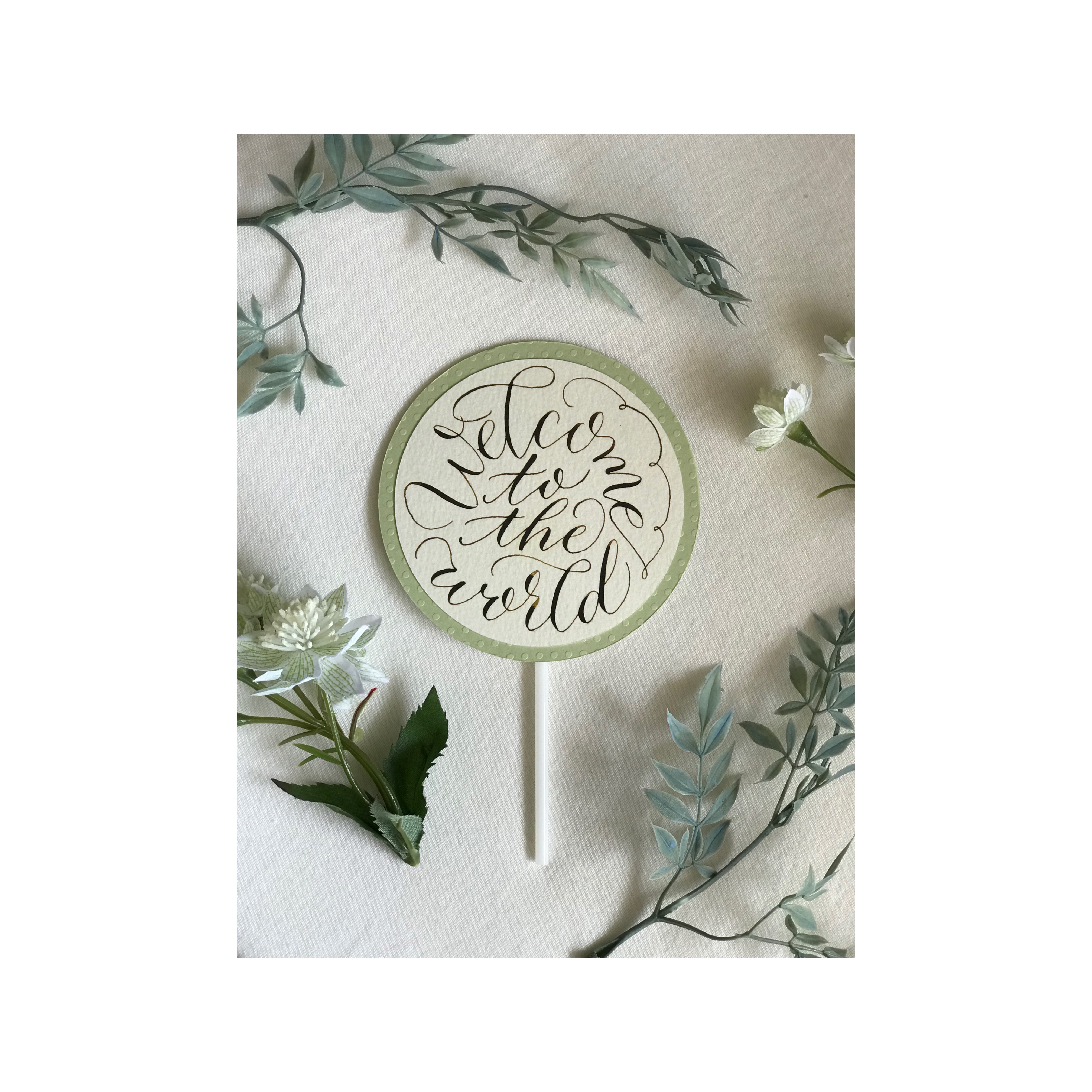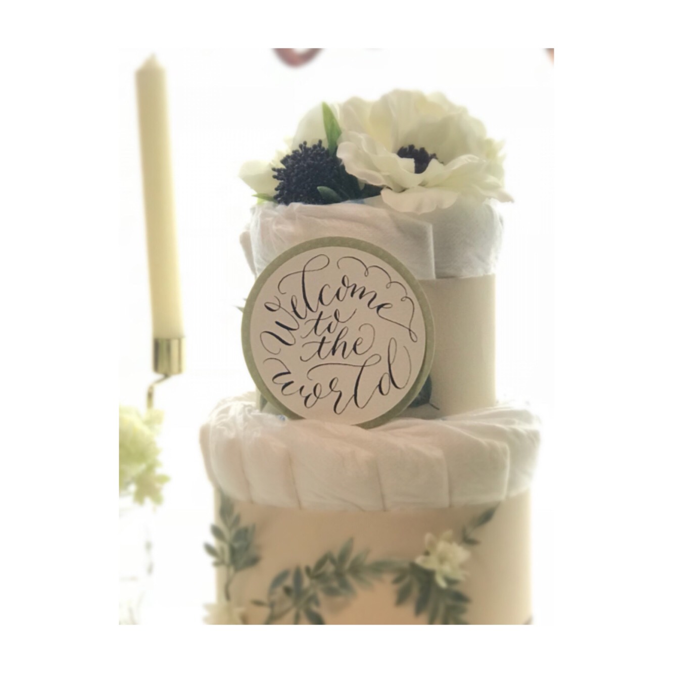 ダイパーケーキのデザインに合わせてオーダーしているカリグラフィーピックには 「Welcome to the world」と赤ちゃんの誕生を祝福するメッセージを。 カリグラファー三木愛(みきあい)さんが手掛けるオリジナルピックです。 手書きならではの温かさがあり、出産祝いにぴったりです!