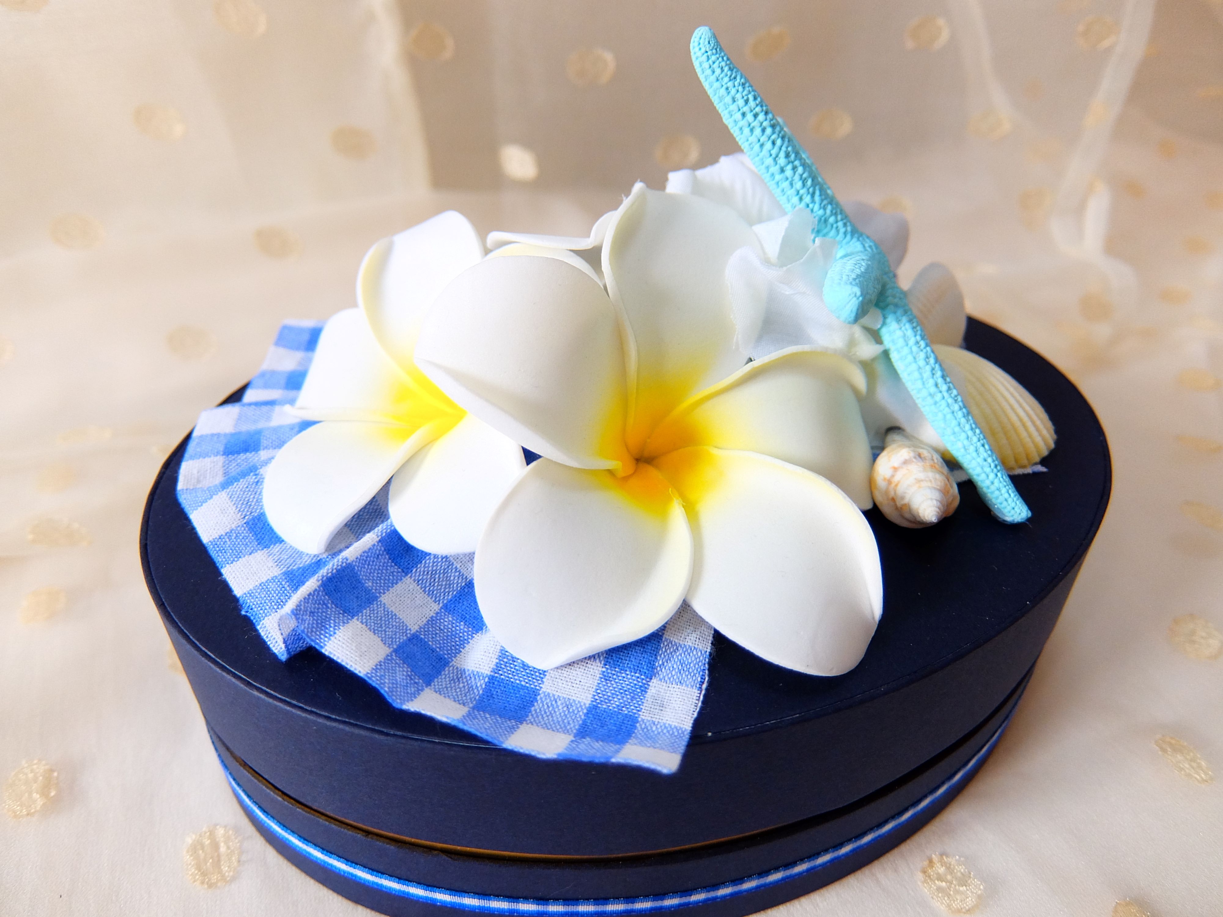 上級バースデープランナーの加藤奈緒が代表を務める、「La fête chez moi(ラフェットシェモワ)」の1段ダイパーケーキです。オムツをキュートなボックスに入れた新タイプです!プルメリアと貝殻を贅沢に飾り、思わず写真を撮りたくなるような海を感じるデザインに仕上げました。