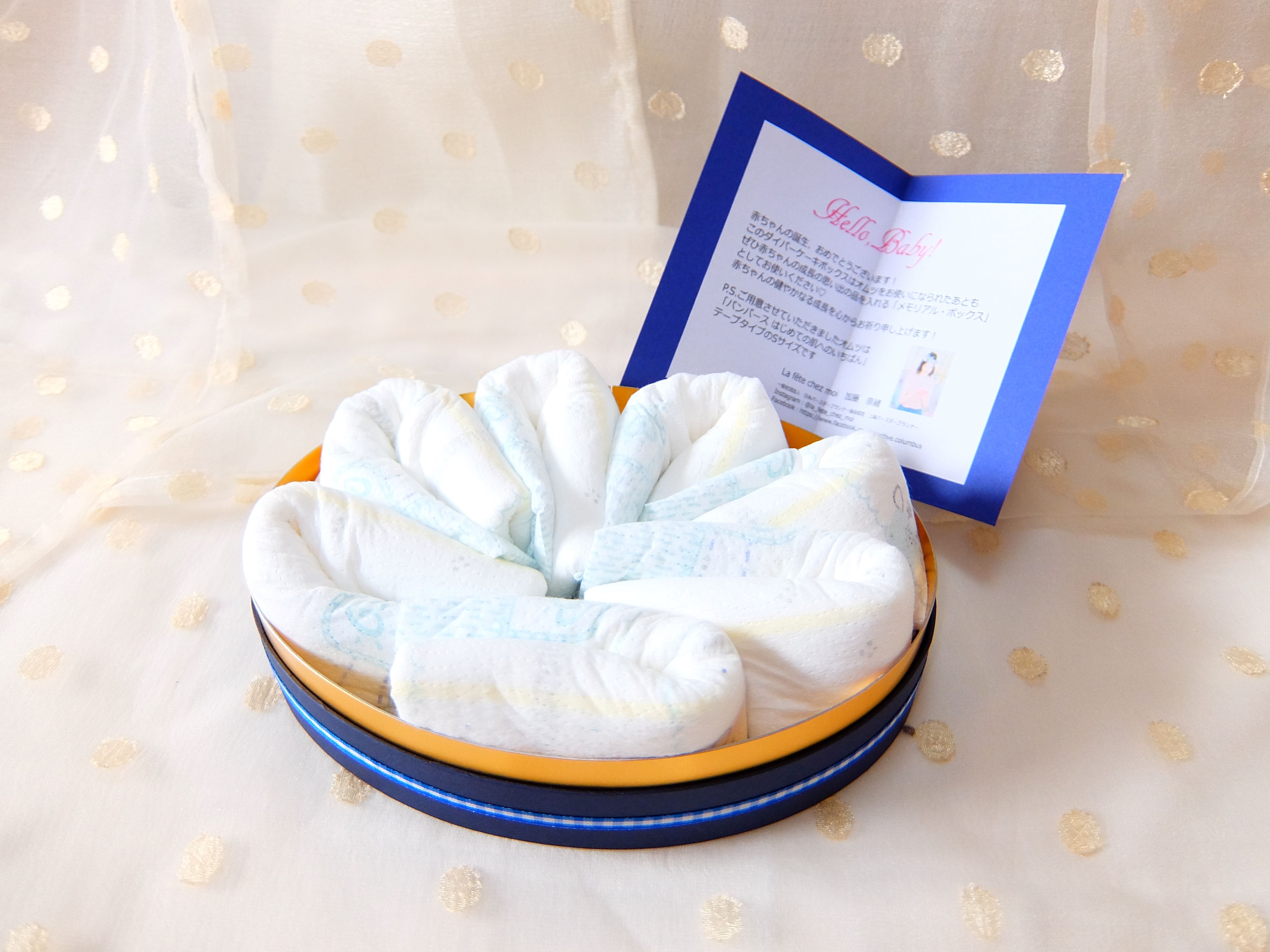 中にお入れしました紙オムツは、「パンパース はじめての肌へのいちばん」テープタイプのSサイズです。出産祝いの品としてお使いになる場合は、出産後なるべく早めにギフトとして贈ることをお勧めします。