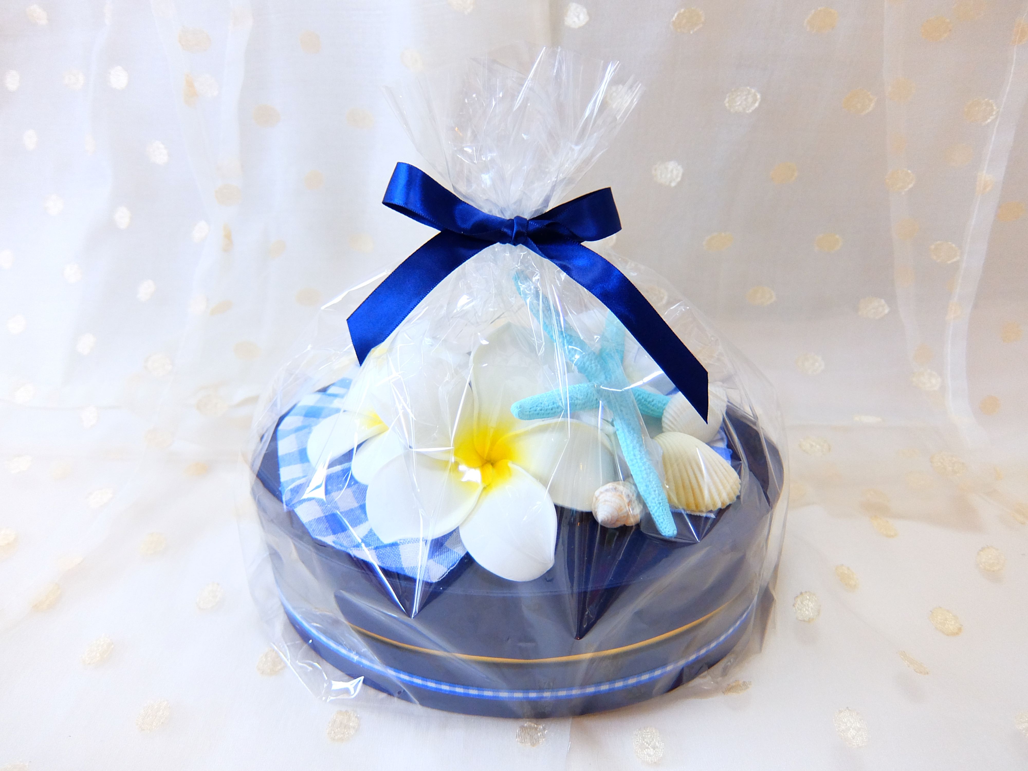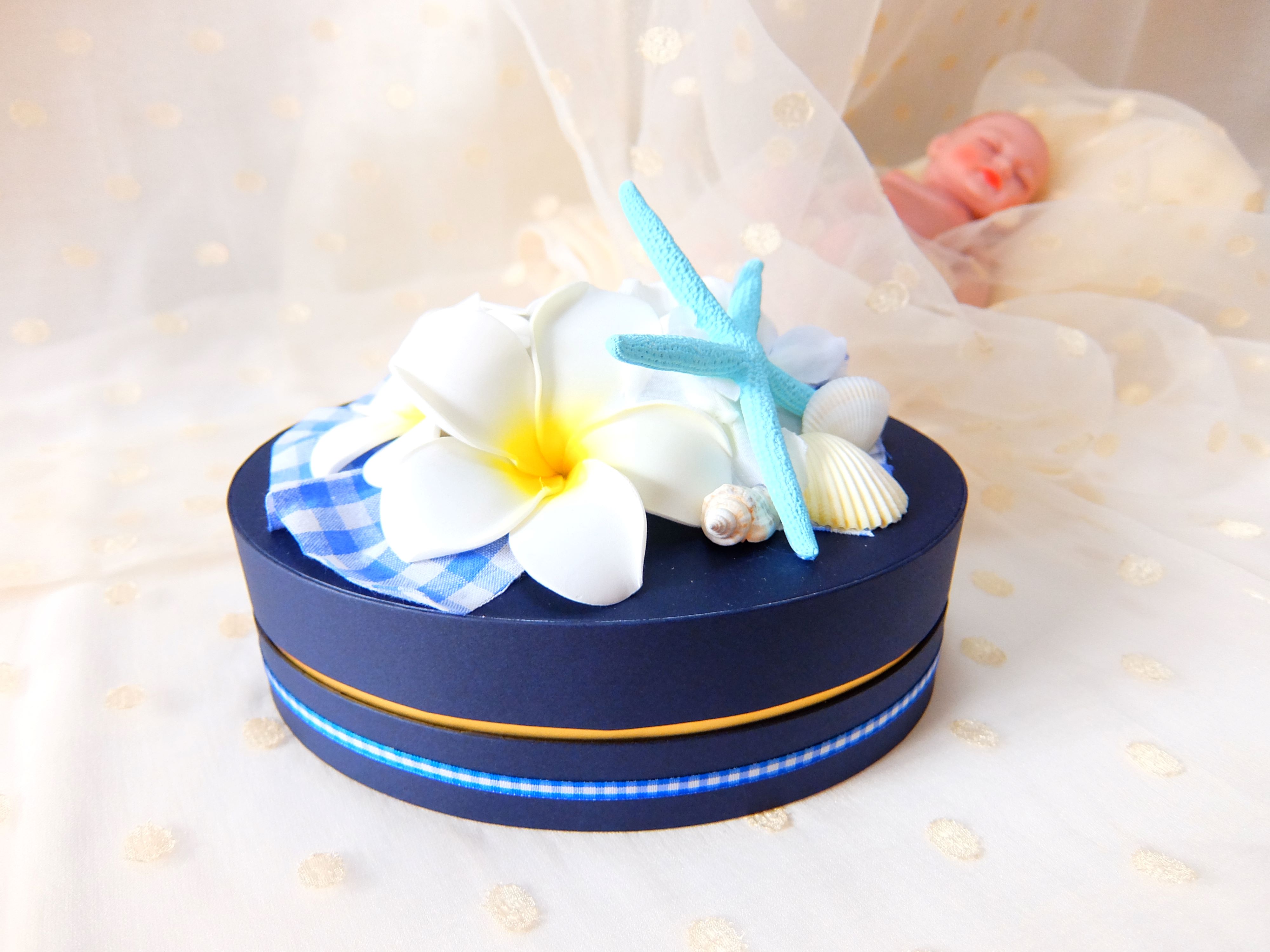 大口注文・法人のお問い合わせはこちら白いプルメリアの花にヒトデや貝殻をあしらい、夏や海のイメージを彷彿とさせる爽やかな雰囲気の1段タイプのダイパーケーキです。オムツはボックスの中に入っています。可愛らしいデザインなので、赤ちゃんの記念撮影のアイテムとして使うのもおすすめです。