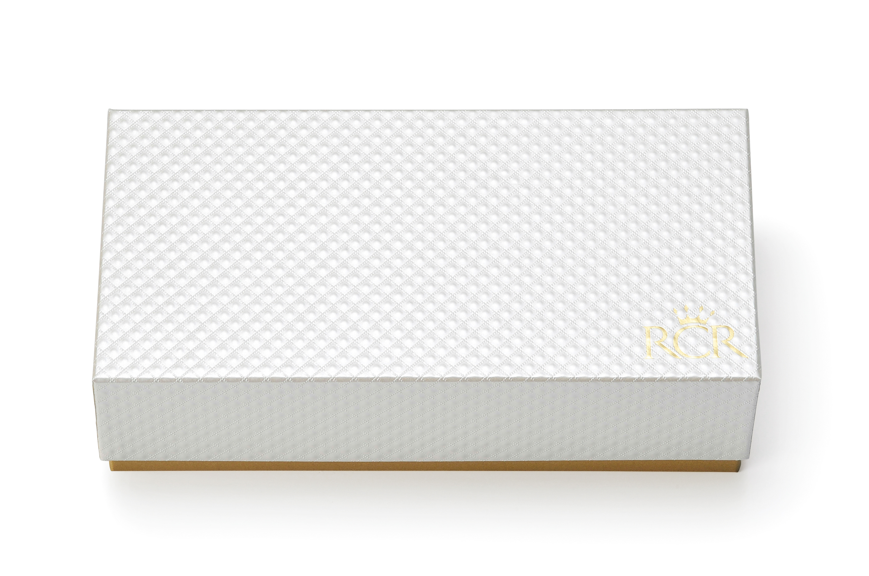 さりげないデザインのあるホワイトのフタと、高級感のあるゴールドのボックスに入れてお届けします。ボックスフタの右下にはゴールドでRCR社のロゴが入っています。