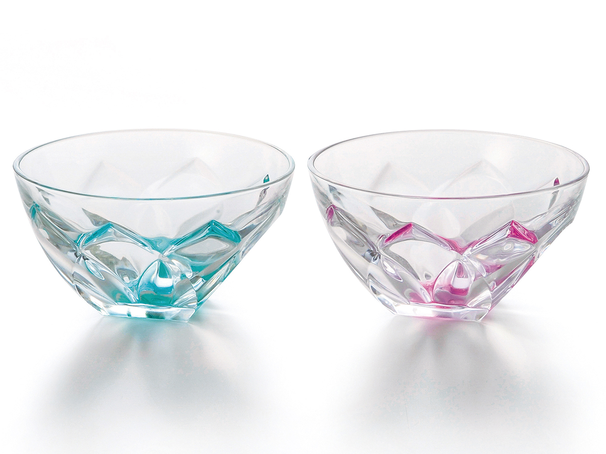 大口注文・法人のお問い合わせはこちらイタリアのRCR社のクリスタルガラスを使用したペアボウルです。涼やかで、光に当たるとキラキラと煌めく様子が美しいですね。ブルーとピンクの器は、かき氷などのデザートはもちろん、素麺のつゆなどを入れるのにもちょうどよいサイズです。