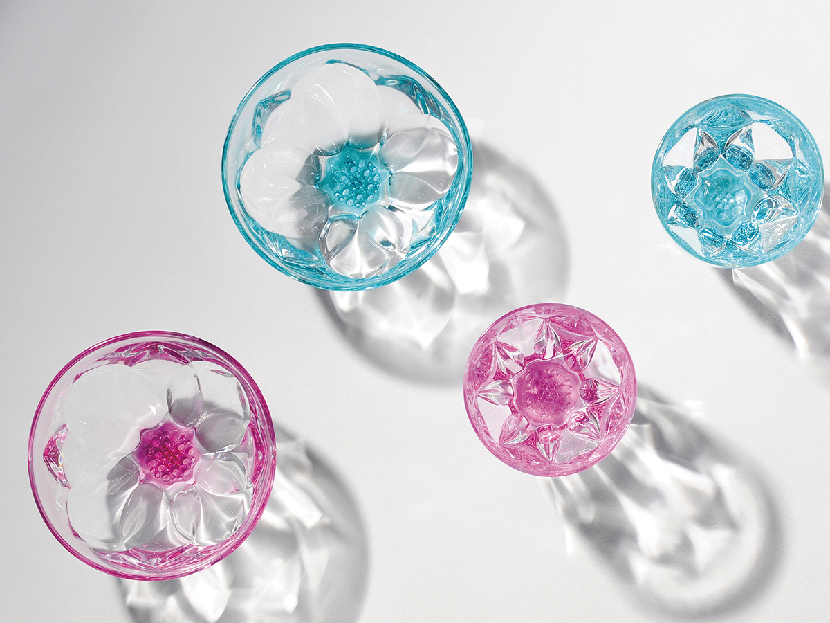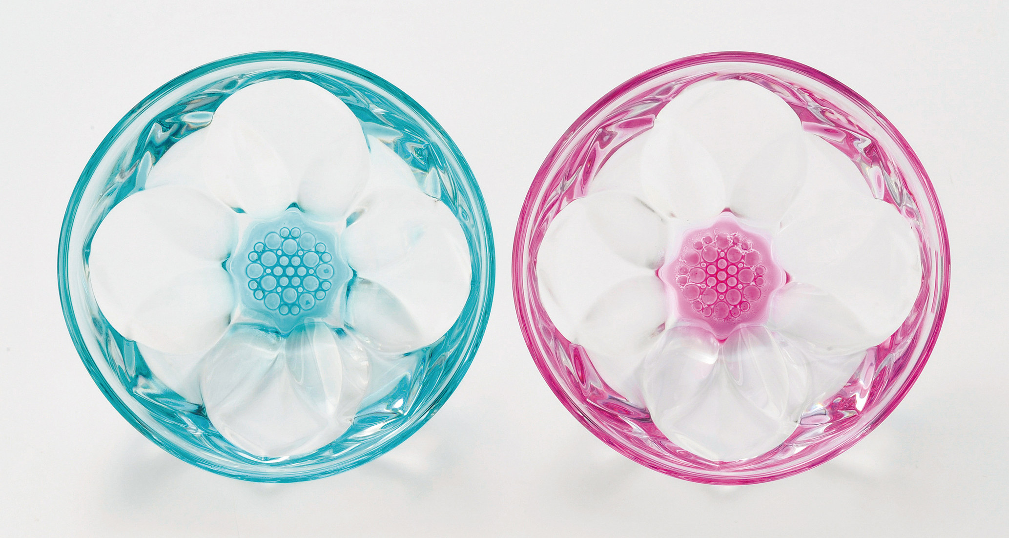 「aito製作所(アイトーセイサクショ)」がお届けする、ペアボウルです。新素材のクリスタル「LUXION」で作られ、美しい輝きが魅力です。ブルーとピンクの2色がセットになっていて、上から見ると花のような模様があらわれます。とても丈夫なので、お子さまがいても毎日気軽にお使いいただけます。