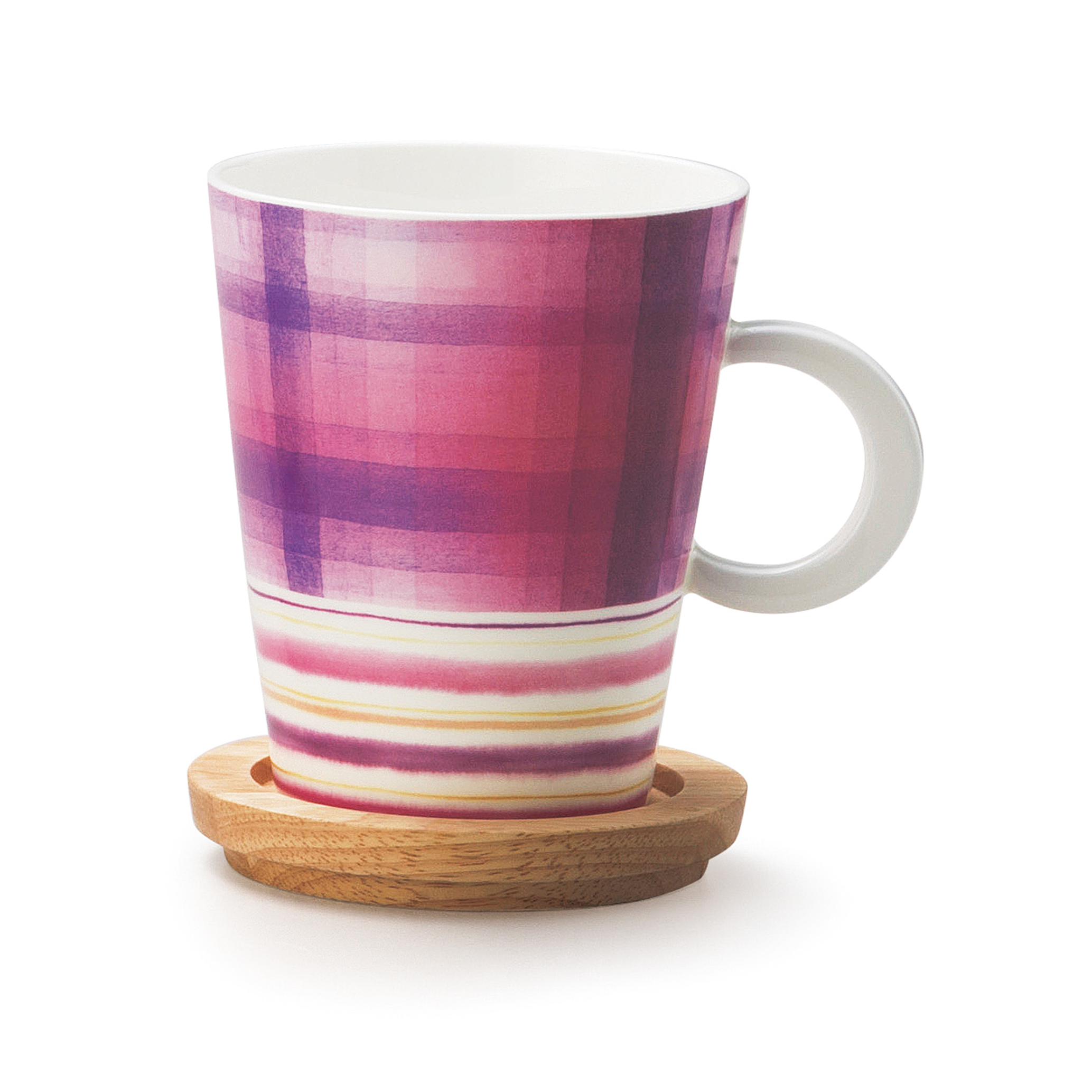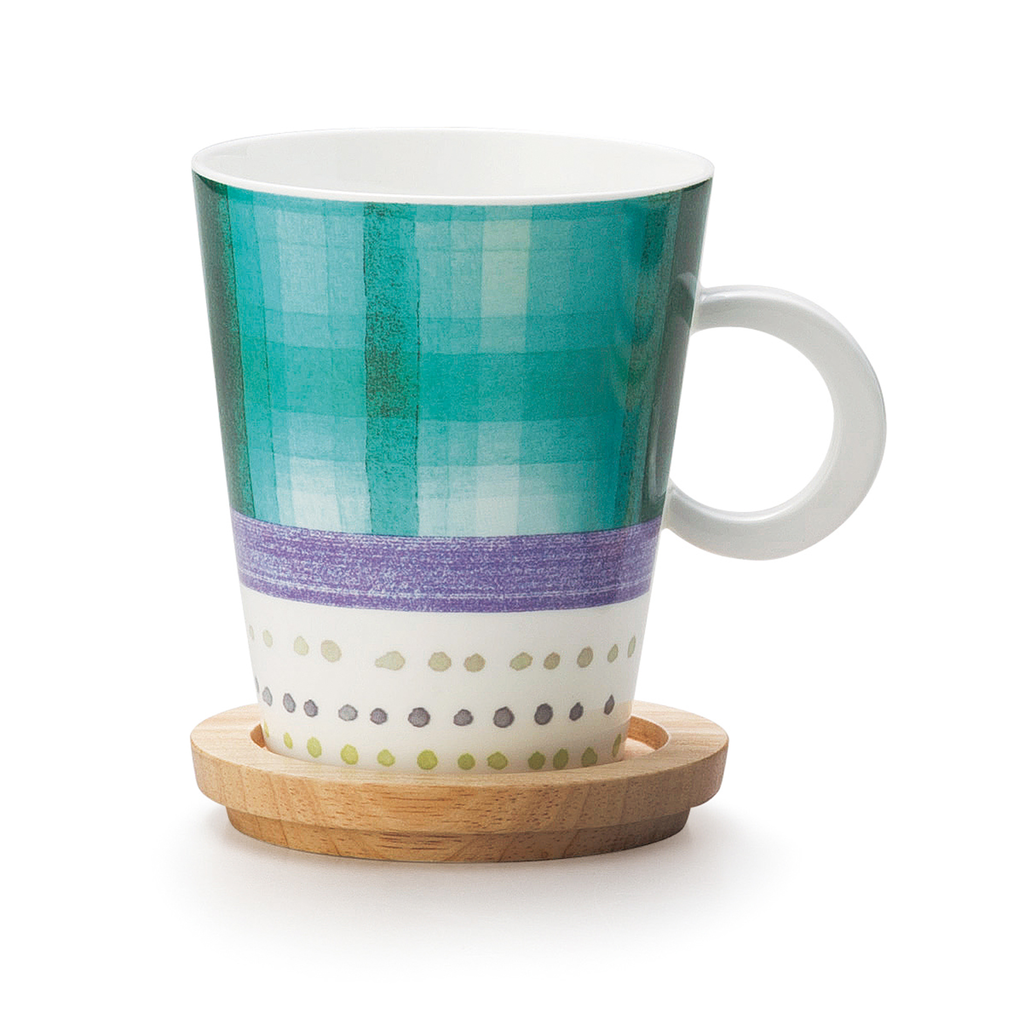 大口注文・法人のお問い合わせはこちらダイアン・ハリソンの水彩タッチのチェック柄が、柔らかな印象のマグカップです。ブルーは下半分がドット、レッドはボーダーです。天然木を使ったフタも付いています。フタがあれば飲み物が冷めることを防げるだけでなく、ホコリや虫が入ってしまうこともありません。コースターとしてもお使いいただける、おしゃれなデザインです。 ※電子レンジや食洗機が使用できます。(※コースターは使用不可)