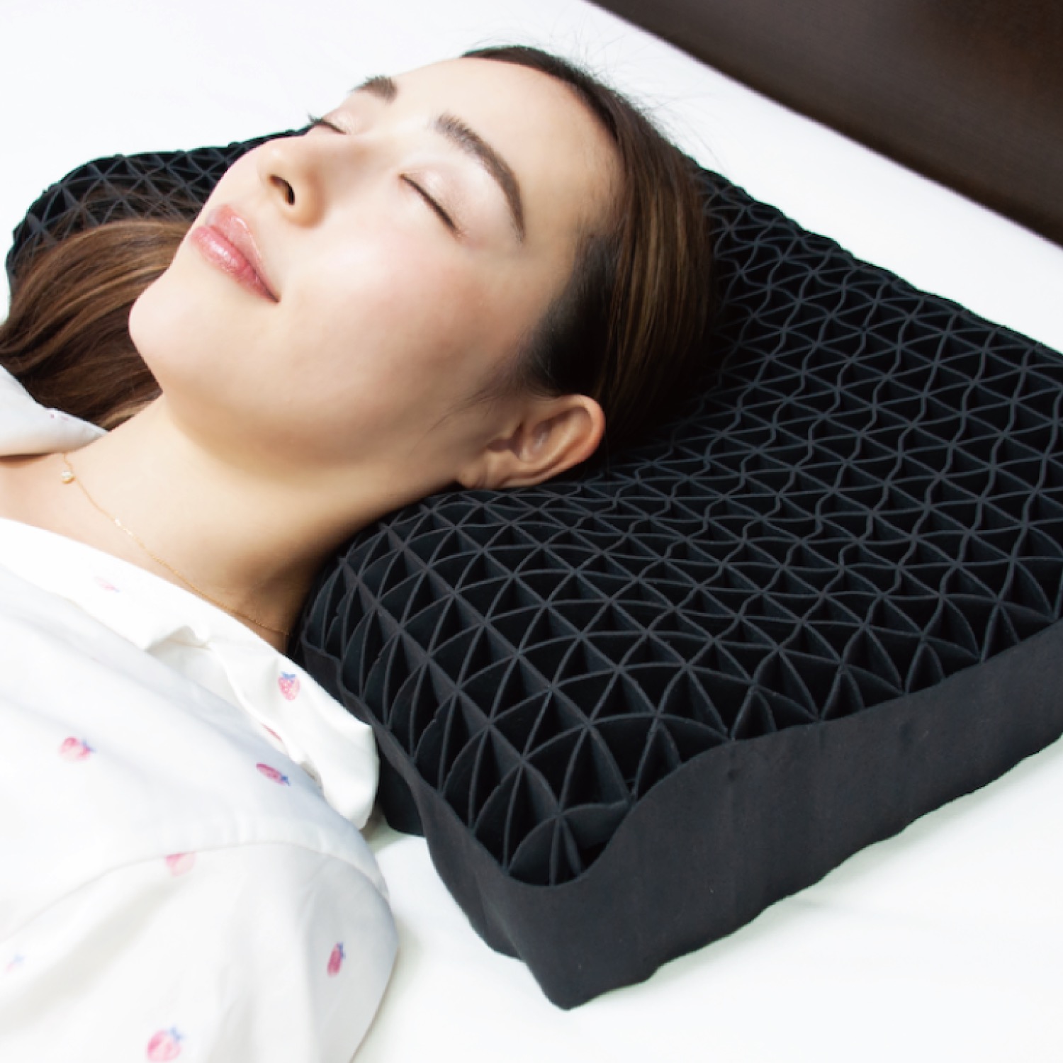 本体は「TPE」という丈夫で柔らかくしなやかさのある新素材で作られています。「三角格子構造」という独自の新構造を用いることにより、頭が包み込まれ、水に浮かぶような寝心地の枕を実現しました。素材には消臭性のある活性炭を配合しているので、黒い色が特徴的です。体圧分散性、スムーズな寝返り、通気性、全てを兼ね備えています。