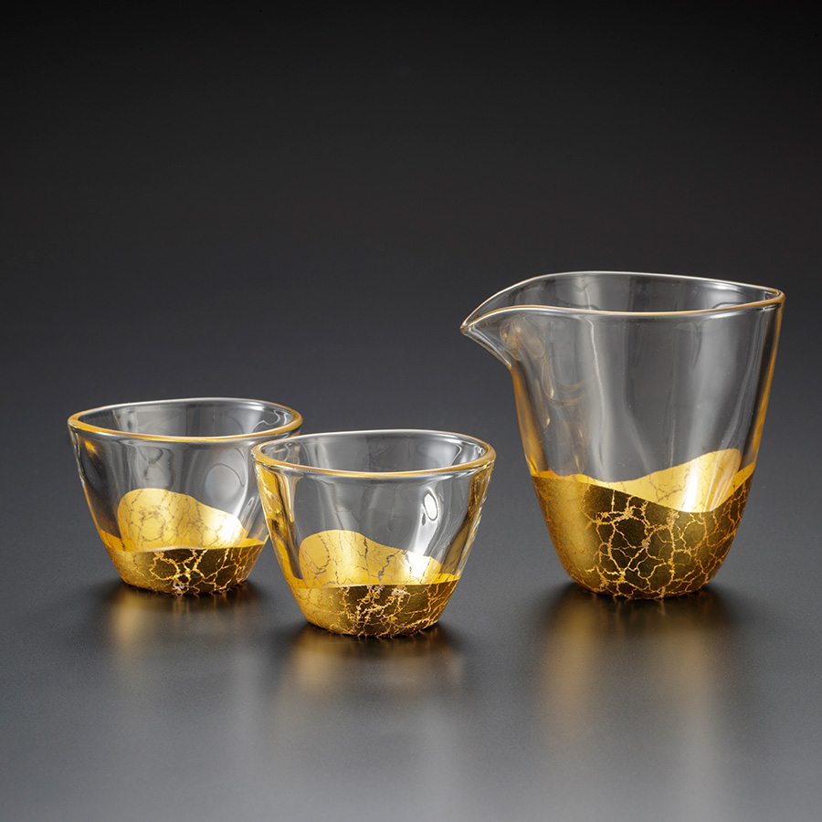 ガラスに金箔を貼った製品が出回りだした頃、よく箔が剥がれると言った相談が相次いだことから開発が始まりました。「箔一」ではただ箔を貼るだけでなく、ひび割れ模様をつけることでどこにもないようなデザインのグラスを開発することに成功。 それ以来箔が剥がれたといった連絡もなく、「箔一」を代表する人気商品になりました。 金箔の割れた文様が光を落とし、優雅なひとときを与えてくれます。文様は、特殊な技法によるもので、一つ一つ割れ方が異なります。趣のある上品な貫入シリーズは結婚祝いなどにも喜ばれるお品です。
