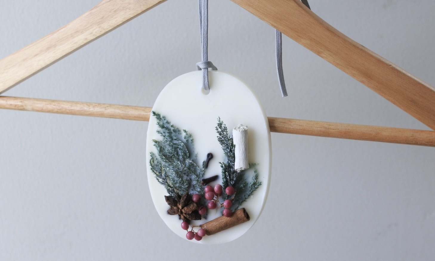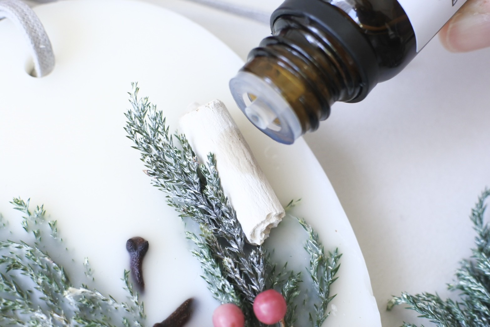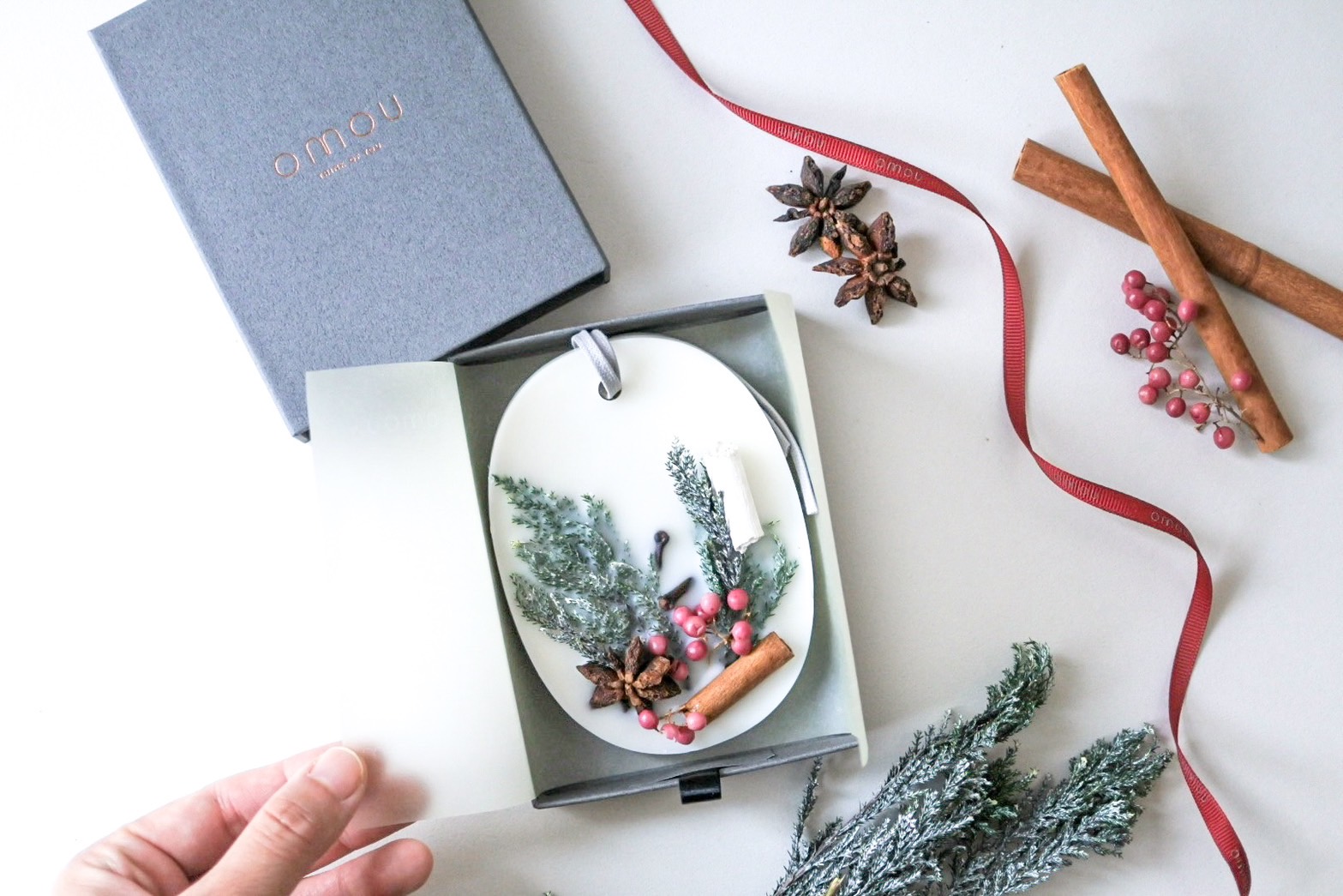 シナモンにコヒバ、ペッパーベリーとまるでクリスマスリースのような素材をあしらったデザインはこの時期限定です。
