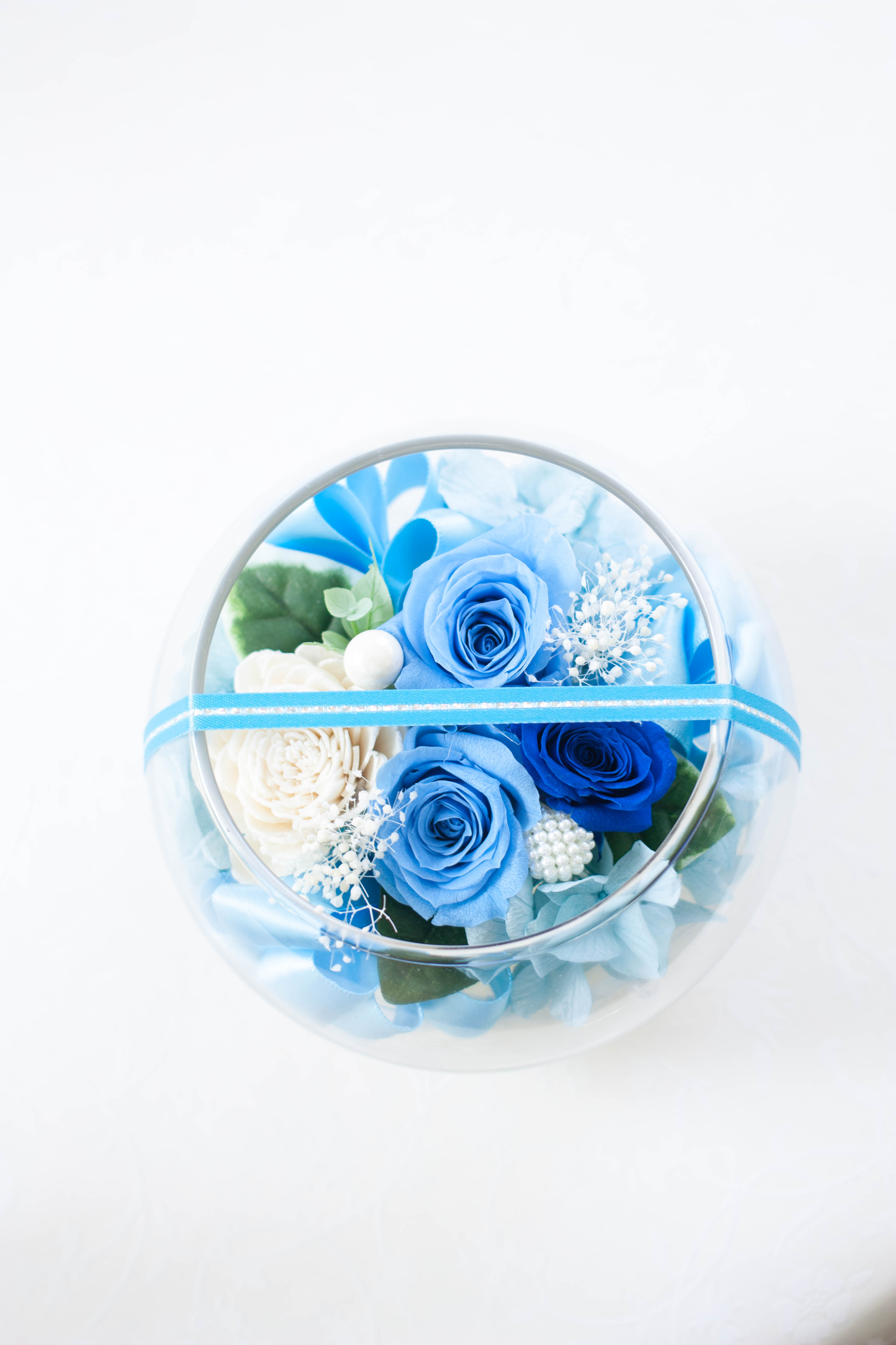 爽やかなブルーのローズが印象的な透明感あふれるアレンジ。 二種類のパールがブルーのお花とマッチし、とても美しく引き立たせています。