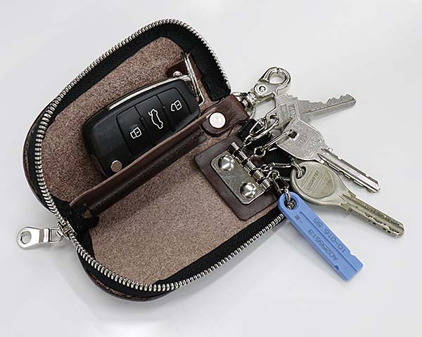 自宅の鍵だけでなく、車のスマートキーまでまとめて収納できるキーケースは、外出時の必需品です。4連もあるので、自宅や職場など鍵を多き持ち歩く方でも安心してお使いいただけます。 チャックも付いているケースなので、鍵同士がジャラジャラすることなく収まります。上質な栃木レザーを使用したキーケースは、性別を問わずお使いいただけるのも人気の理由です。