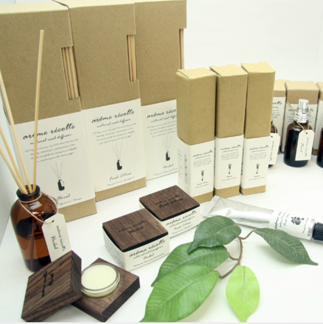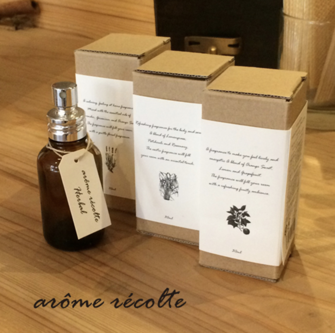 「アロマレコルト」の製品は植物から大切に抽出された 天然の エッセンシャルオイルをベースにサトウキビやトウモロコシ、米などから作られたベジタブルアルコールを使用。原料すべて植物性100%にこだわっているブランドです。