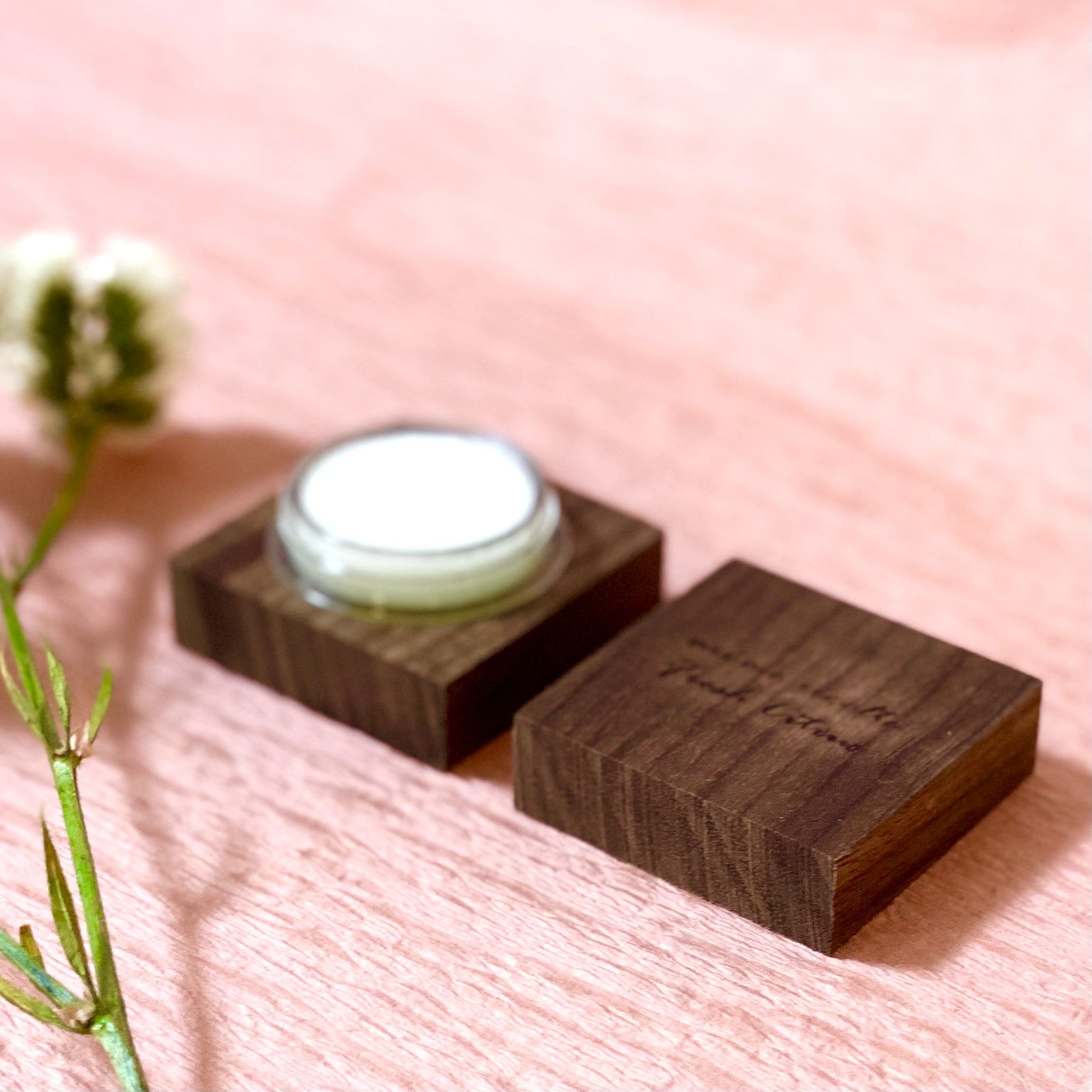 植物から大切に抽出された天然のエッセンシャルオイルを使用した練り香水です。全成分植物由来の原料で作りました。容器はウォールナットで作り商品名の焼印を施しました。天然の香りをお楽しみください。