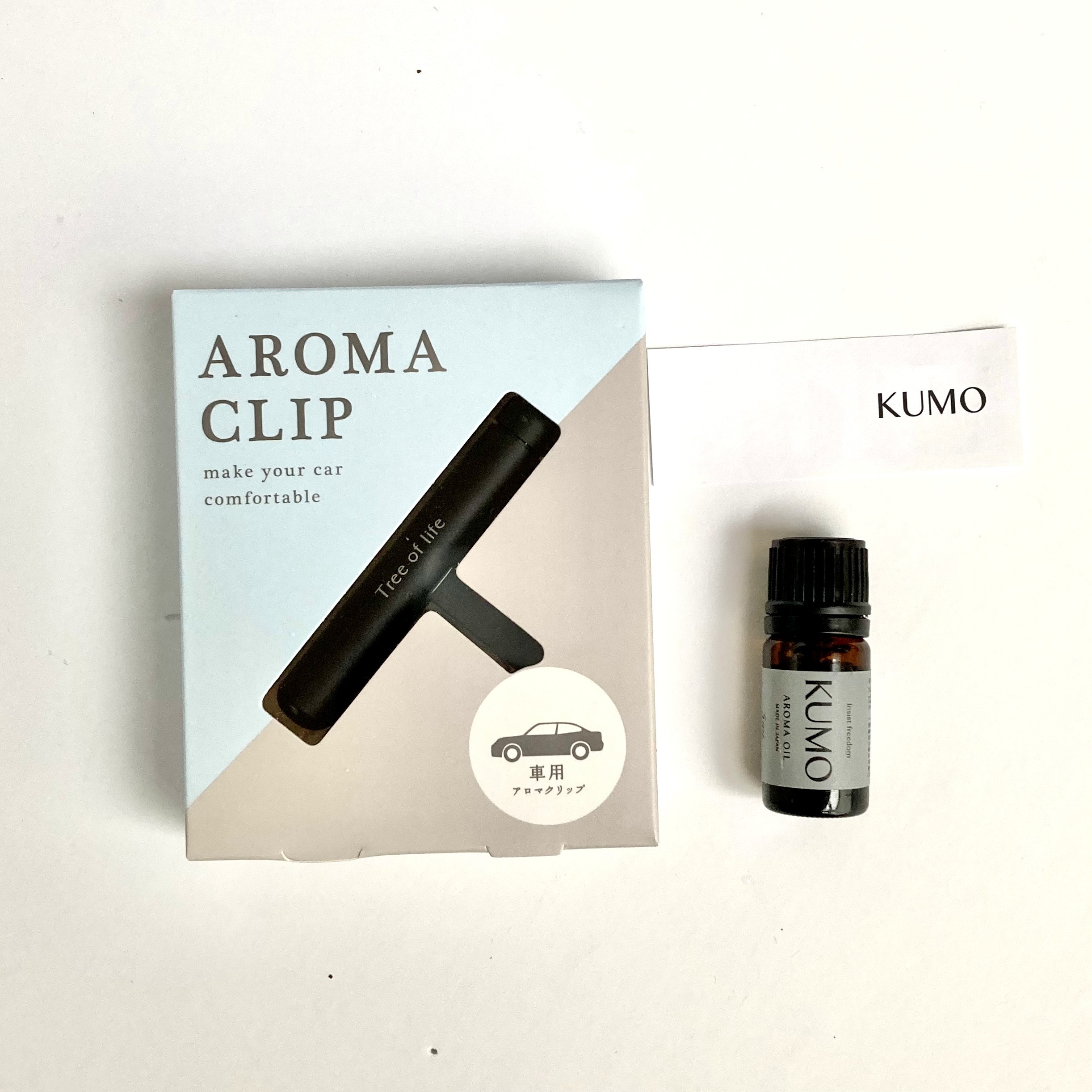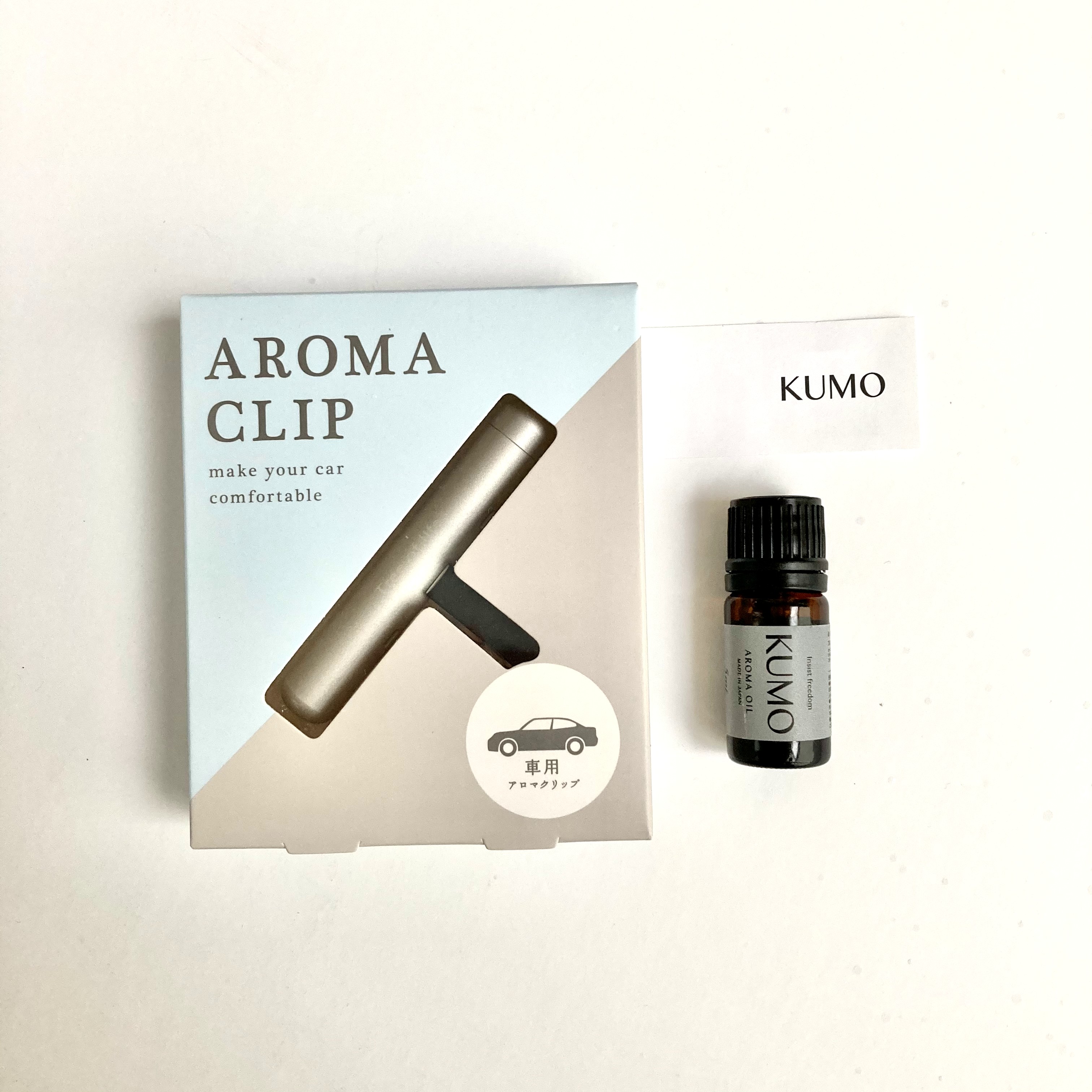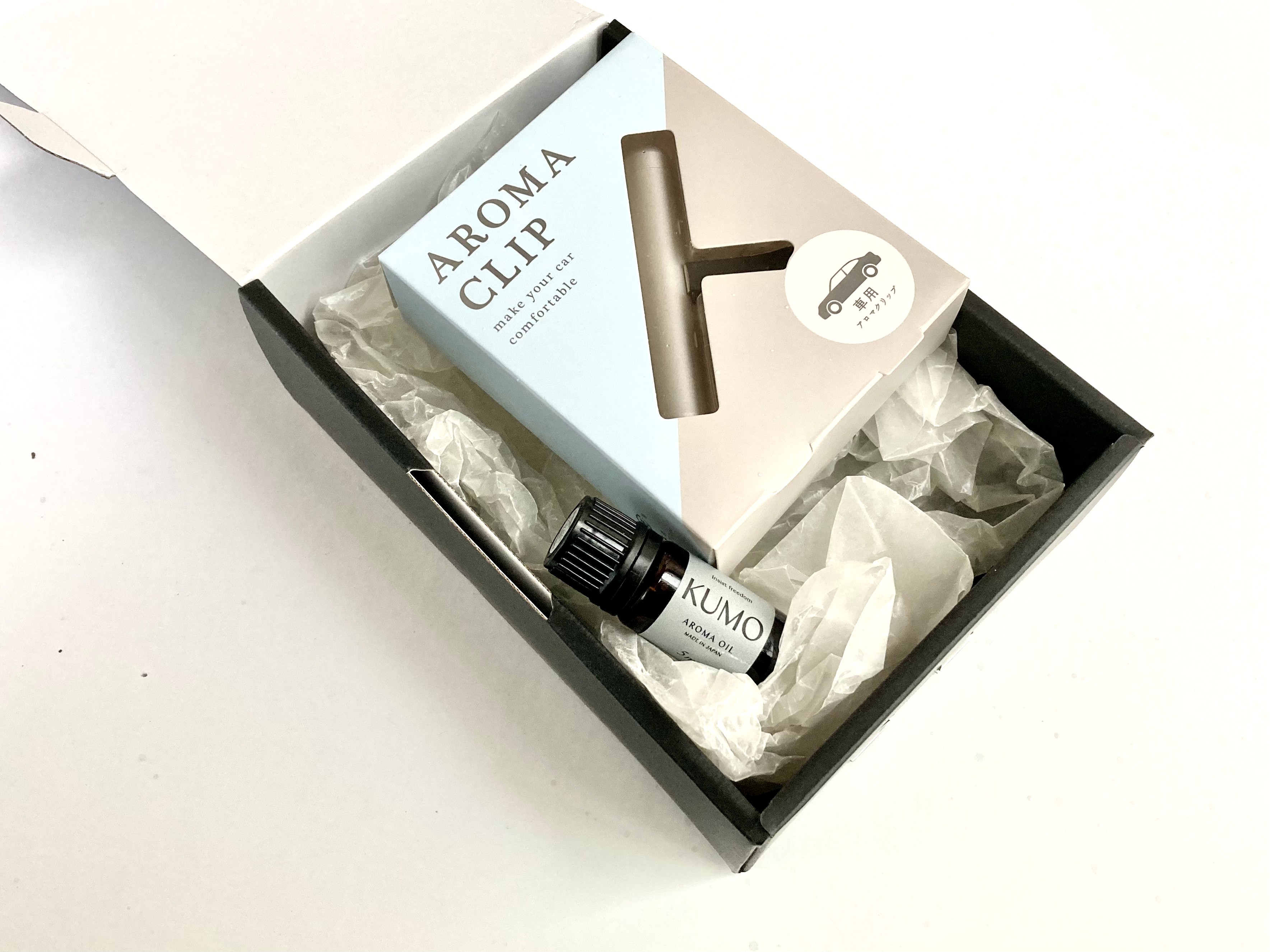 車で香りを楽しめる「KUMO」のカークリップセット。車専用のカーディフューザーは簡単に取り付けることができ、付属のアロマオイルを垂らすだけで車の中でも身近に香りをお楽しみいただけます。老若男女問わず、車持ちの方におすすめのギフトです。