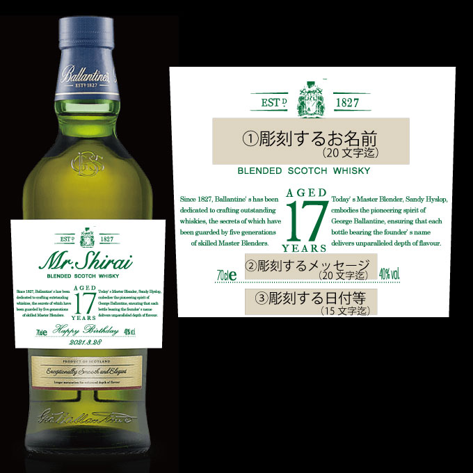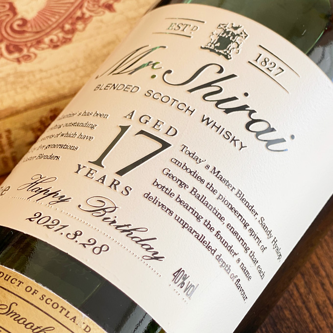 ひと手間かけた名入れ商品を手掛けるギフトショップ専門店「セリジエプラス」が、高級ウィスキー「バランタイン17年」にオリジナルの名前やメッセージをしっかりと刻印します。一つ一つ手作業で彫刻した世界に一つのボトルは、インテリアとして飾るのもおすすめです。※20歳未満の方への酒類の販売はいたしません。