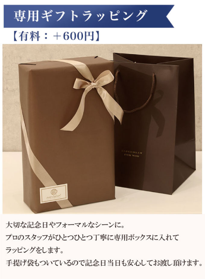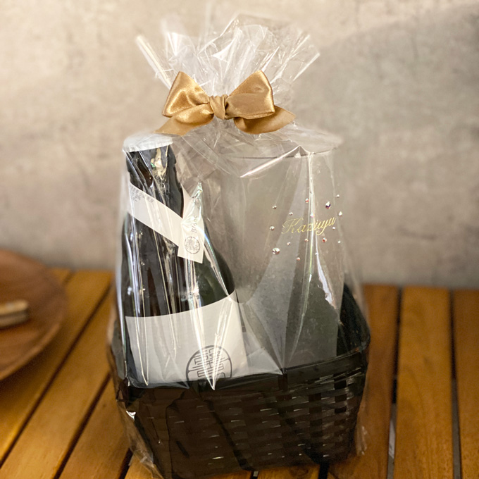 その場ですぐに開ける場合やカジュアルなギフトには無料ラッピングがおススメ。ゴールドのリボンでラッピングをして竹のかごにお入れします。手提げ袋などはつきません。