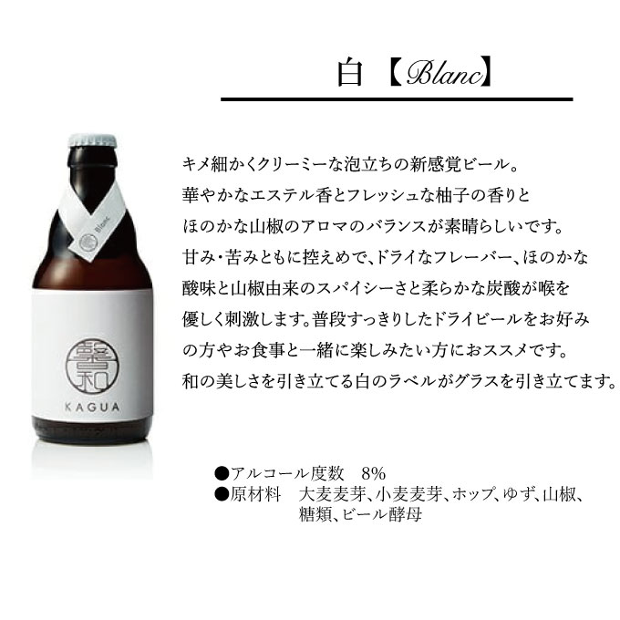 「和の食卓に映えるビールを世界中の人に楽しんでもらいたい」という想いを出発点に、FarYeastBrewingが企画したオリジナルレシピをもとにベルギーで醸造しています。 日本を象徴するハーブである柚子(高知県産)と 山椒(和歌山県産)を使った、「和の食卓に映えるかぐわしさ」が特徴です。 のどごしはなめらかで柚子と山椒の香りを微かに感じることができます。 毎日の食卓をドキドキさせる。家族との楽しい会話にワクワクする。そんなひと時を、KAGUA片手に価値ある時間へ。