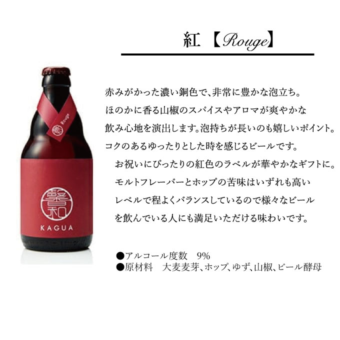 お祝い事にぴったりの紅白ビール、コク深い「紅」かフレッシュな「白」どちらかお好きなKAGUAをお選び頂けます。