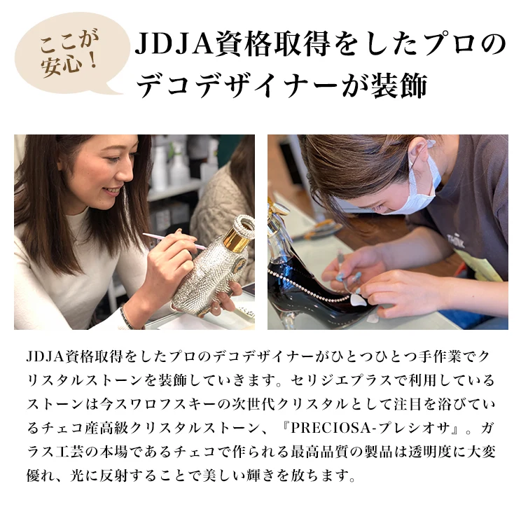 JDJA資格取得をしたプロのデコデザイナーがひとつひとつ手作業でクリスタルストーンを装飾していきます。ペアサーモスタンブラーにさりげなく装飾されているストーンは、今注目を浴びているチェコ産高級クリスタルストーン、『PRECIOSA-プレシオサ』。 ガラス工芸の本場であるチェコで作られる最高品質の製品は透明度に大変優れ、光に反射することで美しい輝きを放ちます。クリスタルの輝きはお祝い事にぴったり!