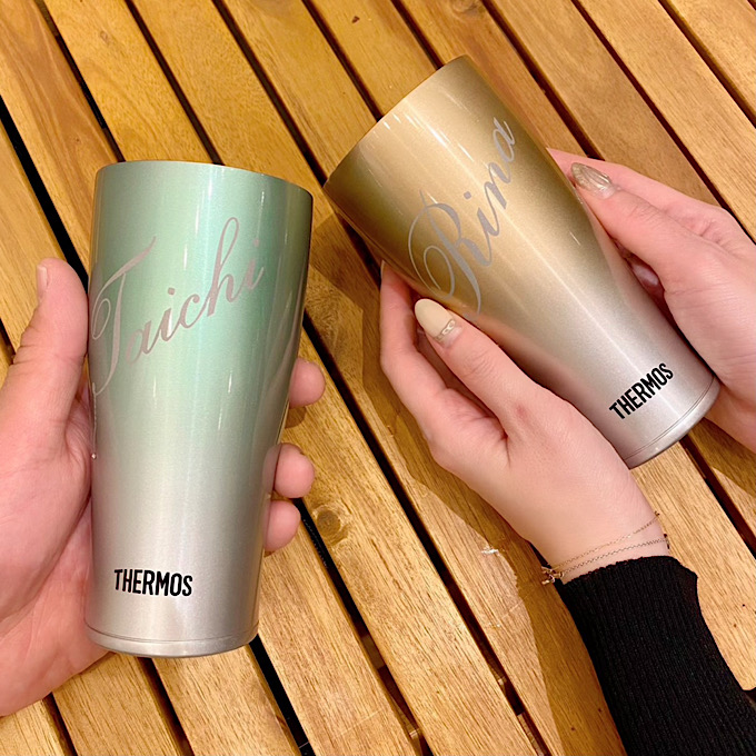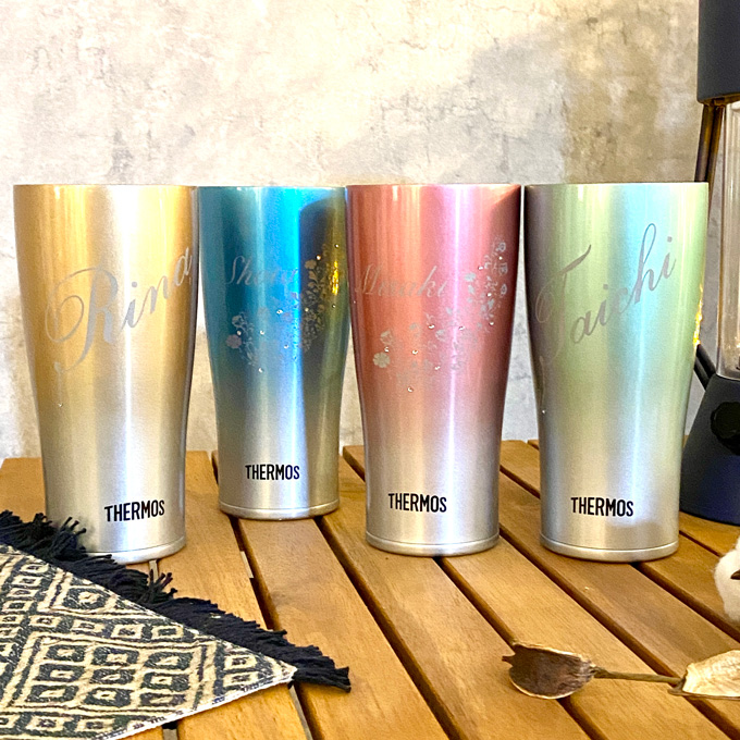 大口注文・法人のお問い合わせはこちらステンレス魔法瓶構造で飲み頃の温度をキープする人気の「THERMOS(サーモス)」タンブラー。 美味しさ長持ち!真空断熱構造で温かさ冷たさをキープします。冷たいビールや麦茶、カクテルなどにもぴったりの容量420mlです。ご自宅やオフィス、アウトドアやホームパーティー、スポーツ観戦など様々な場面でおススメです。 「CerisierPLUS(セリジエプラス)」のスタッフが「もらって嬉しい」デザインを考案しオリジナルを考えました。お誕生日やご結婚のお祝いなどに喜んでもらえる毎日使えるペアギフトにおススメです。色鮮やかなカラーリングで楽しいドリンクタイムを。 お好きなデザインと選べる4色、世界でたったひとつのオリジナルタンブラーで楽しいひと時を。